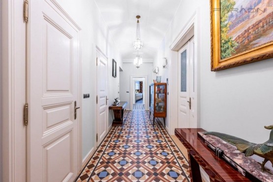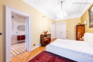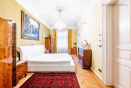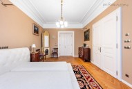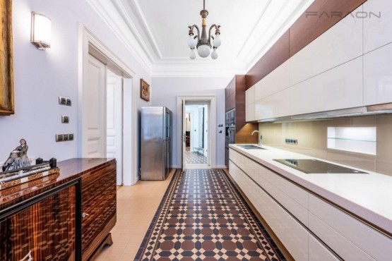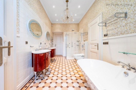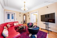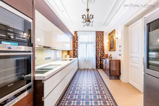 Nabízíme pronájem nádherného zařízeného luxusního bytu 4+1,  184 m2 v těsné blízkosti Staroměstského náměstí a Židovského hřbitova.  Byt po mimořádně zdařilé komplexní rekon...strukci je situován ve 4.  patře secesního domu s designovým výtahem.  Je zařízen původním historickým nábytkem a disponuje ložnicí,  pracovnou,  obývacím pokojem,  jídelnou,  plně vybavenou prostornou kuchyní,  luxusní koupelnou,  vstupní halou,  technickou a úložnou komorou,  sociální zařízení WC pro hosty a dvěmi balkony.  Kvalitní kuchyňské spotřebiče,  pračka a sušička,  TV,  domácí kino a satelitní připojení.  V koupelně nechybí solitérní vana,  masážní sprchový kout a sociální zařízení WC.  Originální architektonické prvky v bytě dále umocňují vysoké stropy,  velká okna,  repasovaná kachlová kamna a designová původní svítidla.  Dubové parketová podlaha a dekorativní dlažba na podlaze.  Vstupní bezpečnostní dveře,  alarm,  videotelefon.  Podlahové topení s plynovým etážovým kotlem zn.  Viessmann.