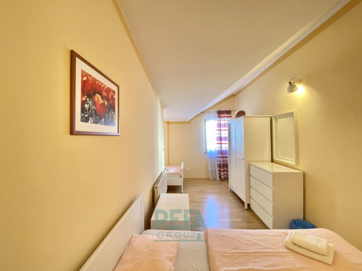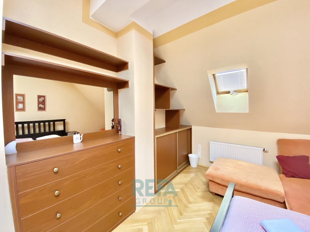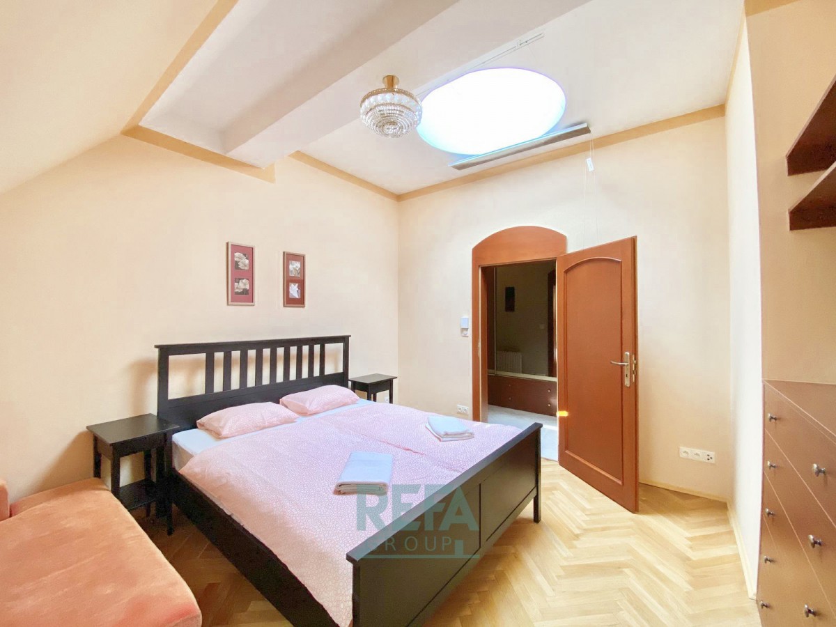 Byt se nachází ve vynikající lokalitě v centru Prahy nedaleko Václavské...ho náměstí ve čtvrtém nadzemním podlaží zrekonstruované budovy včetně výtahu. Po příchodu do bytu se z prostorné chodby bytu dostanete do obývacího pokoje s jídelním koutem a kuchyní. Obývací pokoj je vybaven gaučem, televizí a jídelním koutem pro celou rodinu. Kuchyň je vybavena veškerými spotřebiči, lednicí, sporákem a troubou. Z obývacího pokoje je přístup do ložnice, která je vybavena skříní, zrcadlem a třemi lůžky. Další pokoje jsou vybaveny manželskou postelí, skříní, zrcadlem, gaučem a střešním oknem. K bytu přísluší dvě koupelny. Koupelna je vybavena vířivou vanou, sprchovým koutem, dvěma umyvadly, toaletou a bidetem. V chodbě je umístěna prostorná skříň se zrcadlem. Další místností je komora, kde je umístěna pračka.