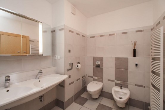 Stylově vybavená kuchyň včetně kvalitních spotřebičů (lednice, mraznička, myčka, sklokeramická deska, horkovzdušná trouba). V bytě jsou dvě koupelny - jedna s velkou vanou a druhá se sprchovým koutem). Byt je velice vzdušný a slunný. K bytu náleží parní sauna. K dispozici je sklep (11m2)