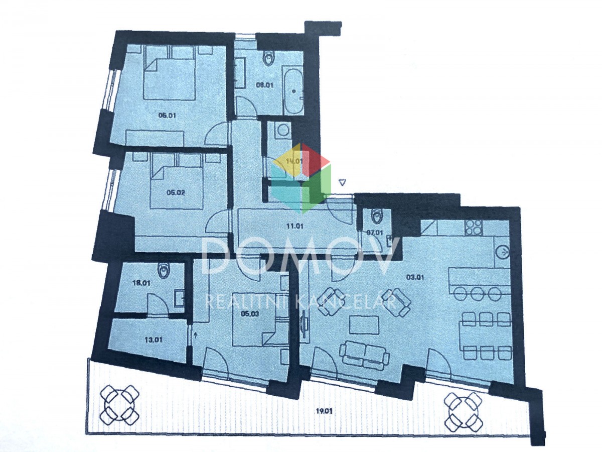 Velkou předností bytu je jeho 25 metrová terasa, na kterou se dostanete jak z hlavní ložnice tak z obývacího pokoje.