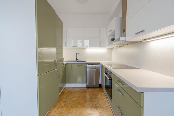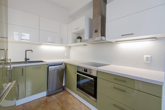 - moderní kuchyňská linka (sklokeramická deska, el. trouba, mikrovlnná trouba, myčka, digestoř, lednice s mrazákem)