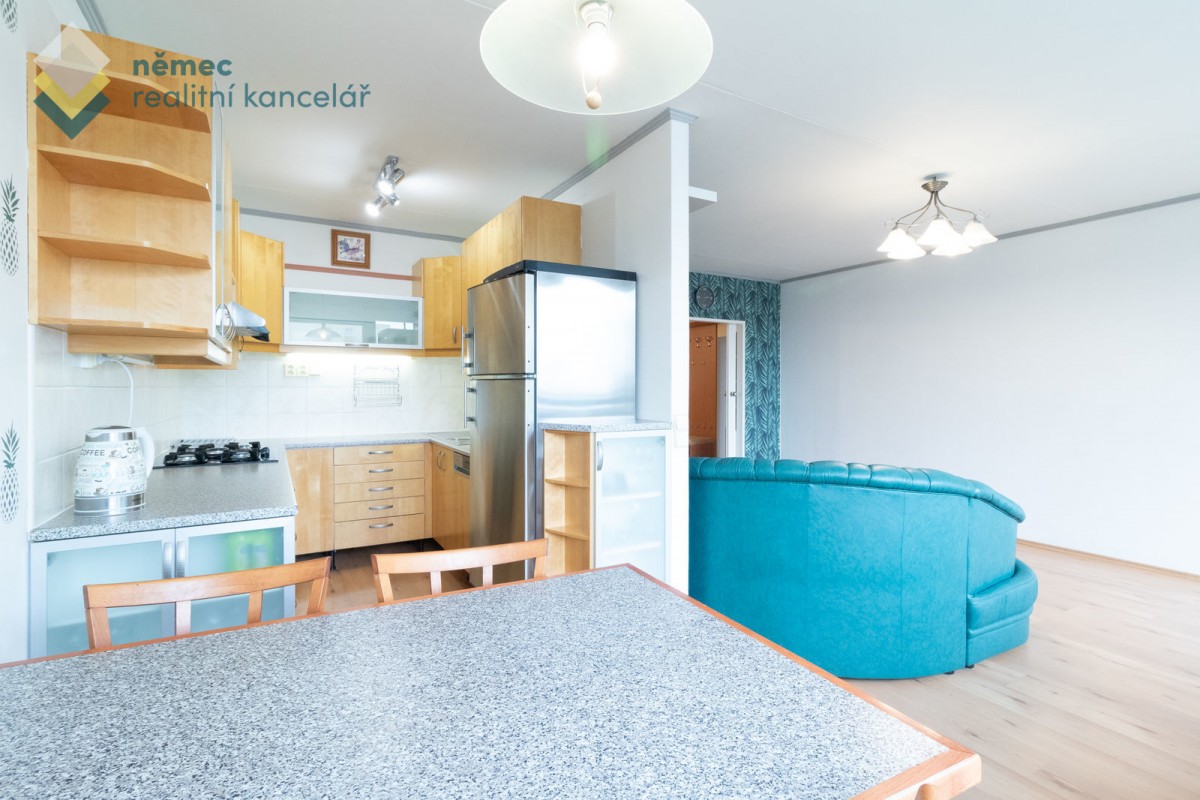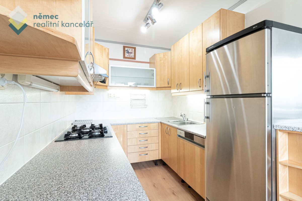 Drobným nábytkem částečně zařízený byt se nabízí k okamžitému bydlení (volné ihned). Oceníte praktický kuchyňský kout se spotřebiči - zabudovanou myčkou, horkovzdušnou troubou, plynovou deskou s pěti hořáky, digestoří a volně stojící lednicí s mrazákem.