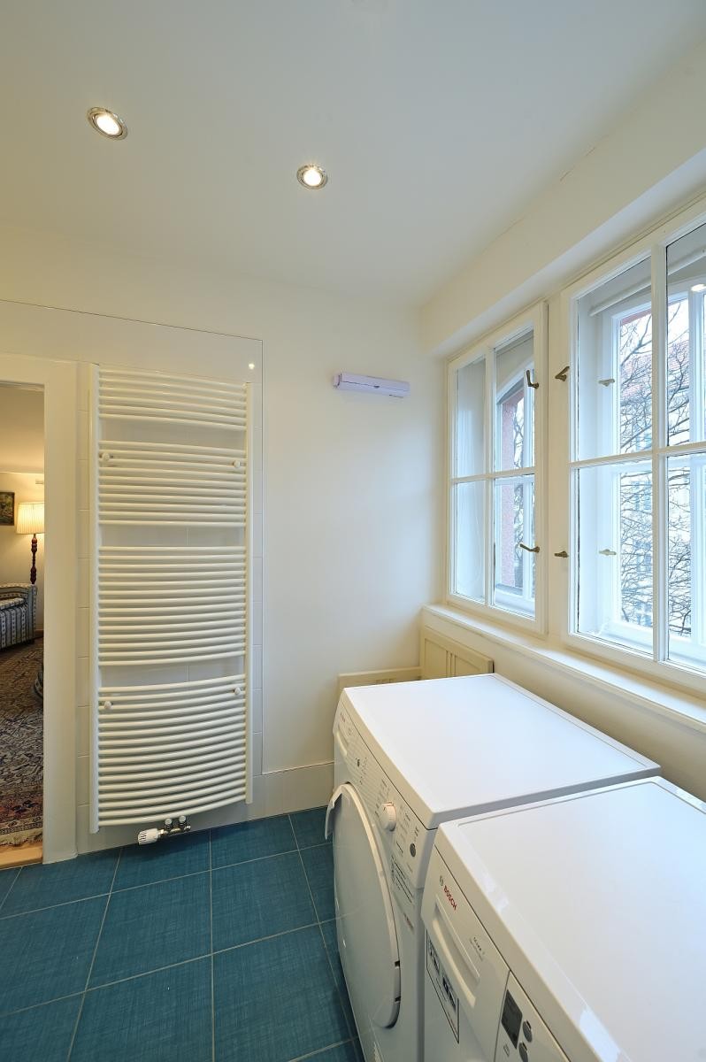 Centrální hala, jídelna, kuchyň, čtyři neprůchozí ložnice, dvě koupelny. Pro někoho, kdo ocení atmosféru vintage stylu kombinovanou s moderní plně zařízenou kuchyní a luxusními koupelnami.