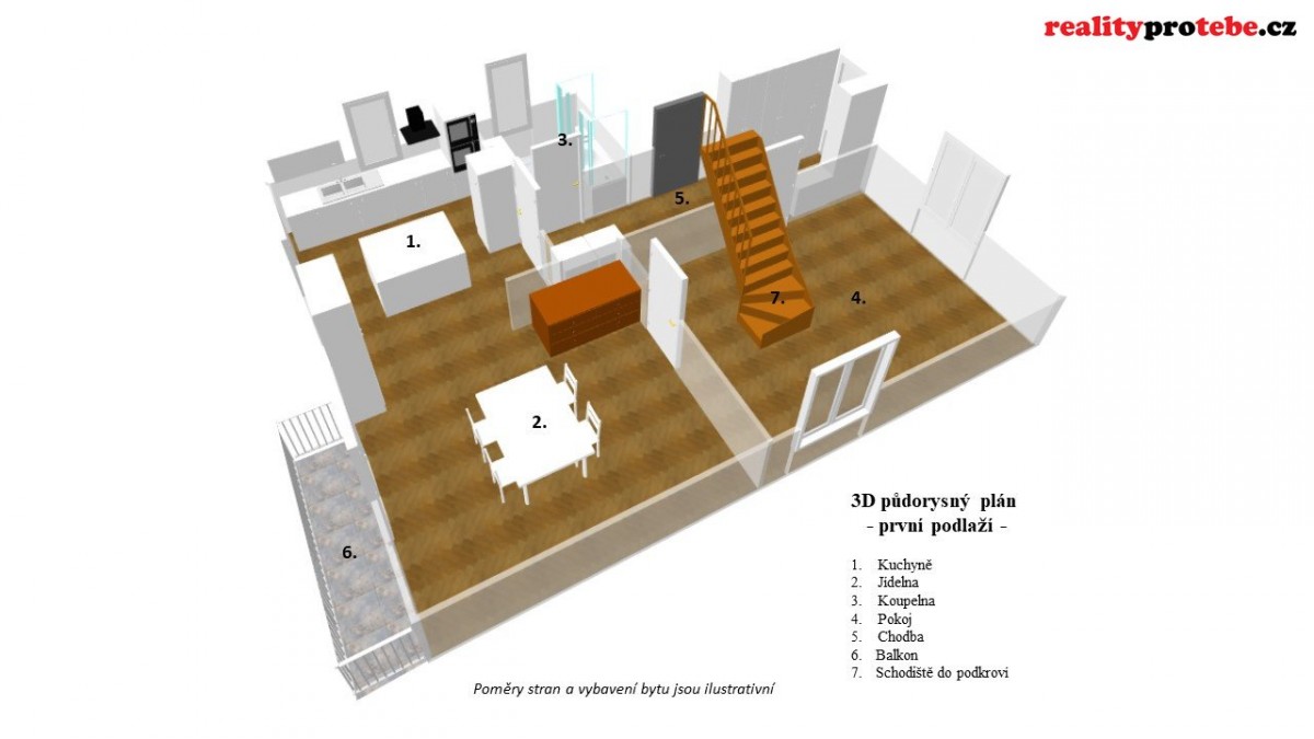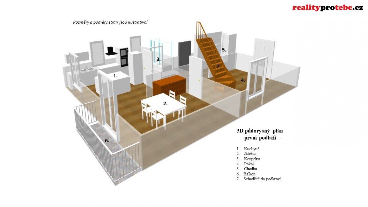 Byt je umístěn ve druhém nadzemním podlaží a podkroví rodinného domu, plynový kotel zajišťující kromě vytápění také ohřev teplé vody je umístěn na chodbě před bytem. Zahrada u rodinného domu není součástí pronájmu. Parkování na možné na ulici v blízkosti domu.