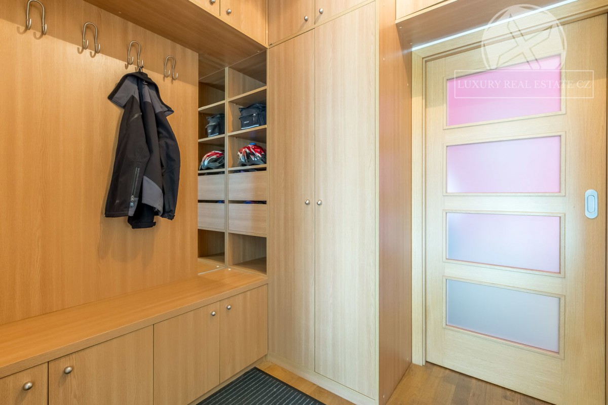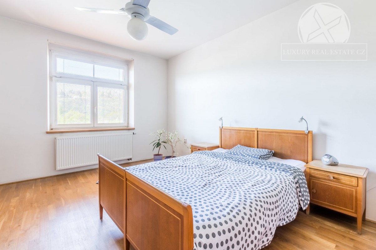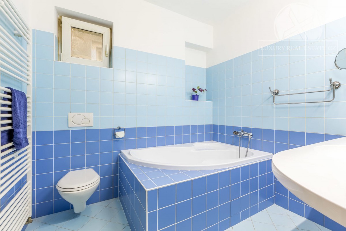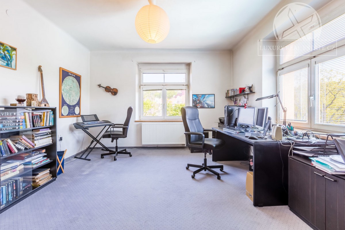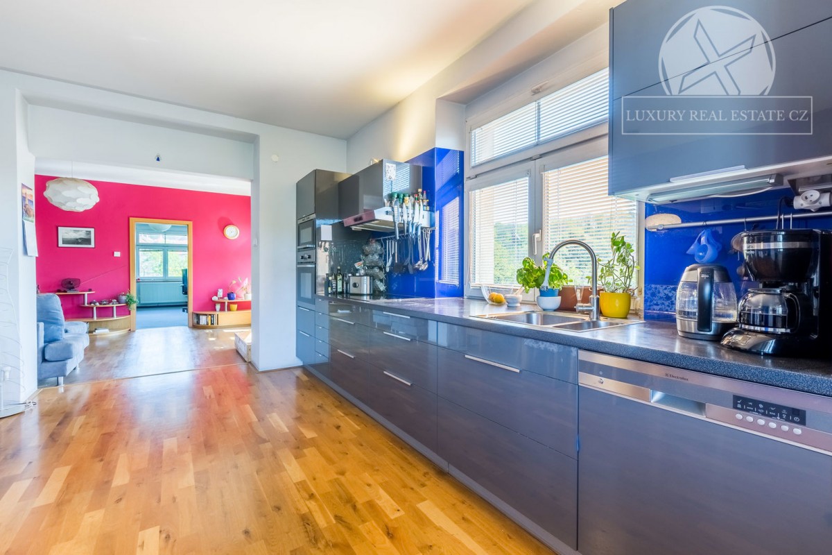 Najdete zde 4 neprůchozí pokoje (ložnice, pracovna, dětské pokoje), obývací pokoj jako středobod bytu a samostatná velice prostorná kuchyně s jídelním koutem a spíží. Ze sociálního zázemí pak 2 koupelny a oddělené sociální zařízení WC. Samozřejmostí je také předsíň s botníkem a šatní skříní. Celkově je byt velice světlý, neboť je orientace oken na J, V i Z - tedy o denní světlo nebudete mít nouzi. Byt se pronajímá zařízený včetně kuchyňské linky včetně spotřebičů a většiny na míru zhotoveného nábytku. Celkově dobrý dojem kvalitního bydlení pak dodávají parketová podlaha, které naleznete na většině podlah.