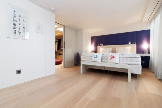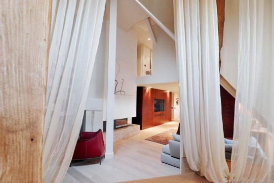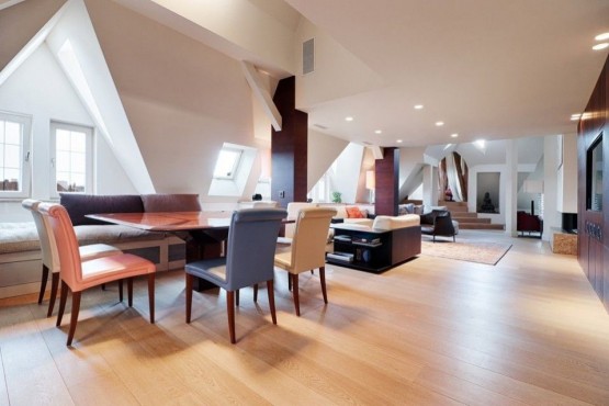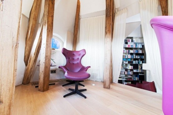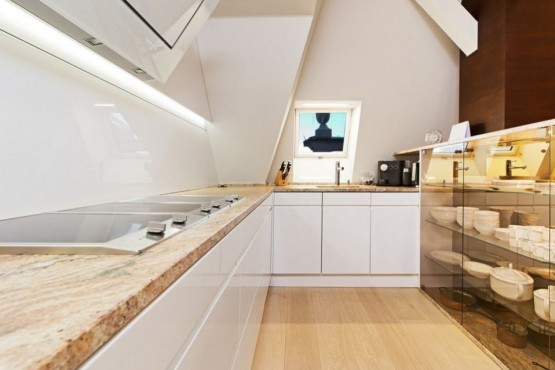 Interiér vyššího podlaží je tvořen obývacím pokojem, kuchyní, 2 ložnicemi, pracovnou, 2 koupelnami, samostatnou toaletou a halou. Nižší podlaží se skládá disponuje dvěma pracovnami, s terasou s letním posezením a neopakovatelnými, jedinečnými výhledy na Pražský hrad, en - suite koupelnou a šatnou, komory a galerie. Kupní cena zahrnuje veškeré luxusní vybavení. Privátní výtah přímo do bytu.
