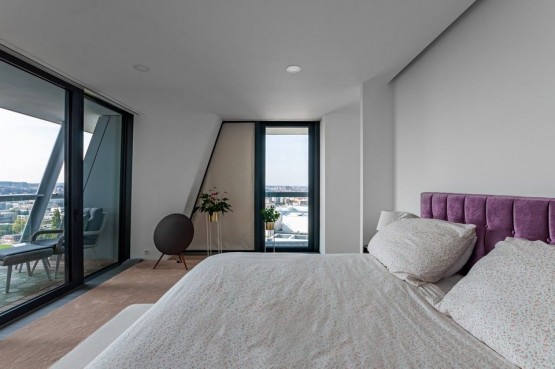 Dispozice bytu 5kk zahrnuje vstupní halu, otevřený prostor obývacího pokoje s kuchyní v bílošedém designu, jídelnou a přímým výstupem na terasu s neopakovatelnými výhledy na Hradčany, 4 oddělené ložnice také s výstupy na terasou, 4 koupelny, další samostatná toaleta pro hosty ve vstupní hale, dostatečné množství úložných prostor, dvě velké šatny. Celý byt lemuje fantastická terasa s neopakovatelnými výhledy na panorama Prahy, která je přístupná ze všech pokojů.