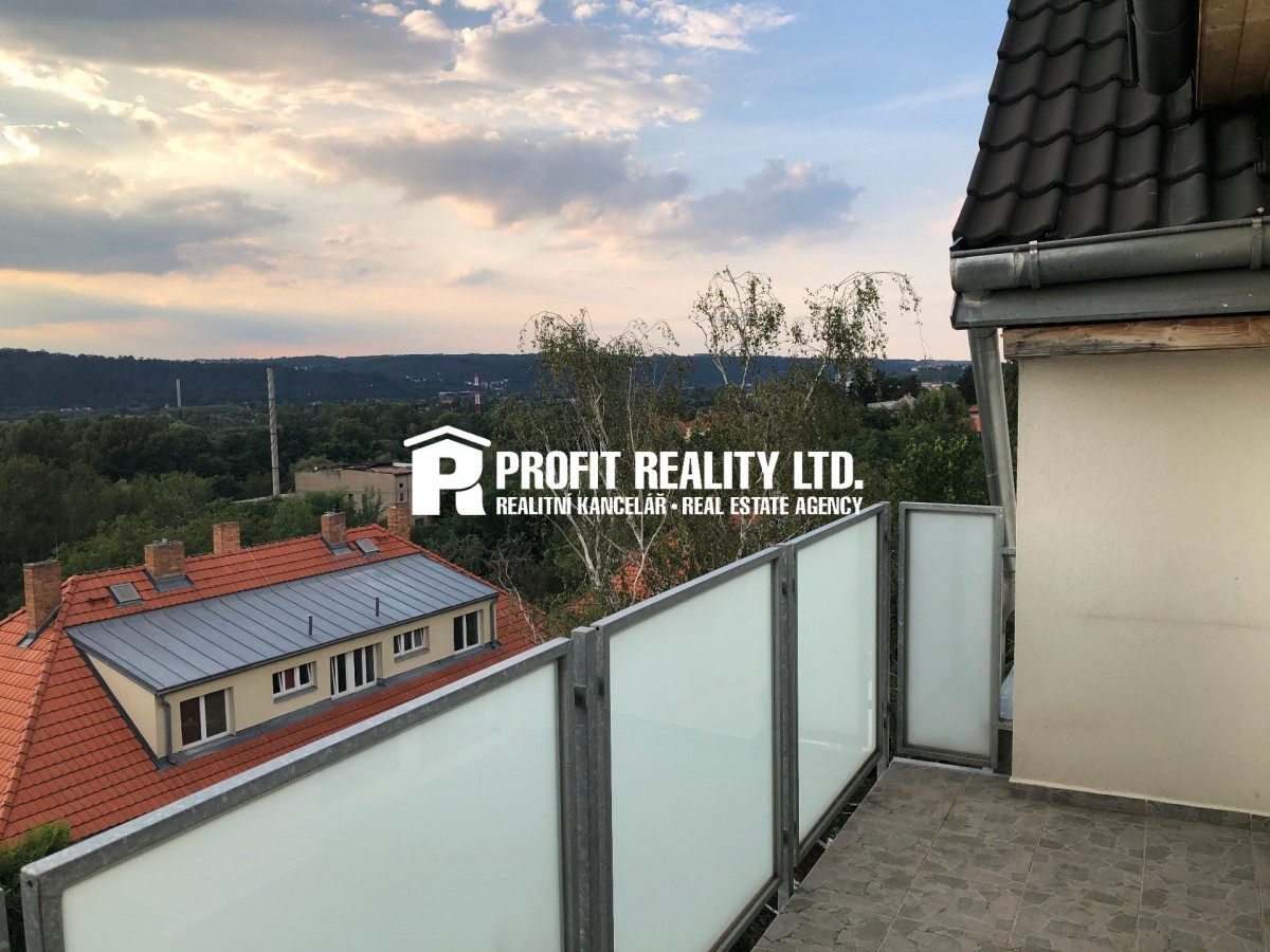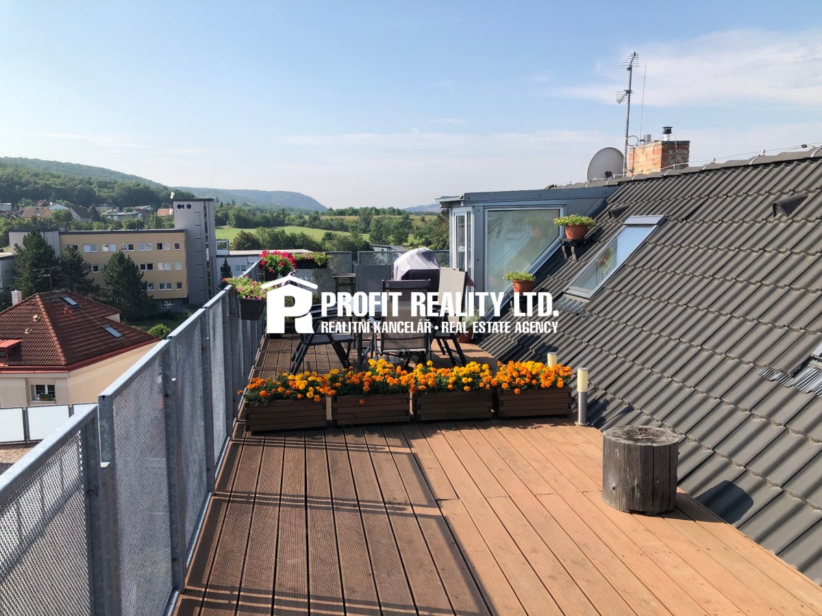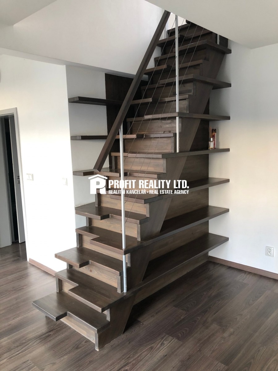 Pronájem luxusního atypického bytu o velikosti 5+kk, 129m2, v nejvyšším (3. a 4. ) patře bytového villa domu s úchvatným výhledem na údolí Vltavy s bakonem a teraso...u. Prosklená francouzká okna v délce přes 3 m navazují dále na balkon. Kuchyně v nadčasovém designu s podsvícením LED světly je vybavena troubou, mikrovlnou troubou, digestoří, myčkou, lednicí a indukční varnou deskou. Luxusní koupelna s vyhřívanou dlažbou, sprchovým koutem a rohovou vířivou vanou. Na podlaze jsou plovoucí podlahy a dlažba. Byt je vybaven bezpečnostními dveřmi, orientačními LED světly na chodbě, vestavěnou skříní ve schodišti do horního patra, přípravou na audio systém. Spodní patro bytu tvoří obývací pokoj s plně vybavenou kuchyní, francouzskými okny a terasou, 2 ložnice, koupelna s rohovou vířivou vanou, masážním sprchovým koutem a toaletou, šatna, toaleta pro hosty a vstupní chodba. V patře jsou dvě podkrovní ložnice a přístup na střešní terasu.