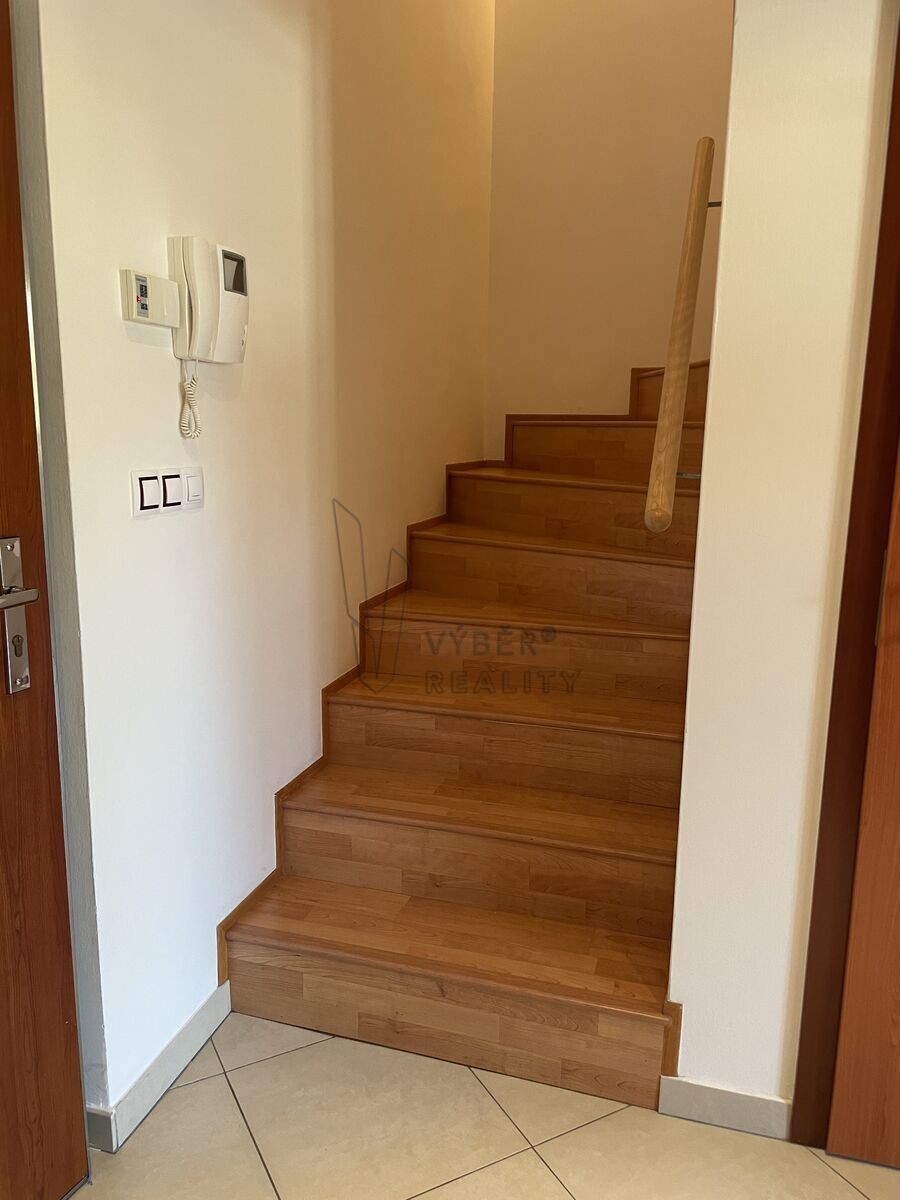 V dolním patře najdete vstupní halu, samostatné sociální zařízení WC s umyvadlem, komoru, obývací pokoj a plně vybavený kuchyňský kout se spotřebiči – sklokeramická deska, trouba, myčka a lednice. Z obývacího pokoje je přístup na balkon orientovaný do klidné, společné zahrady.