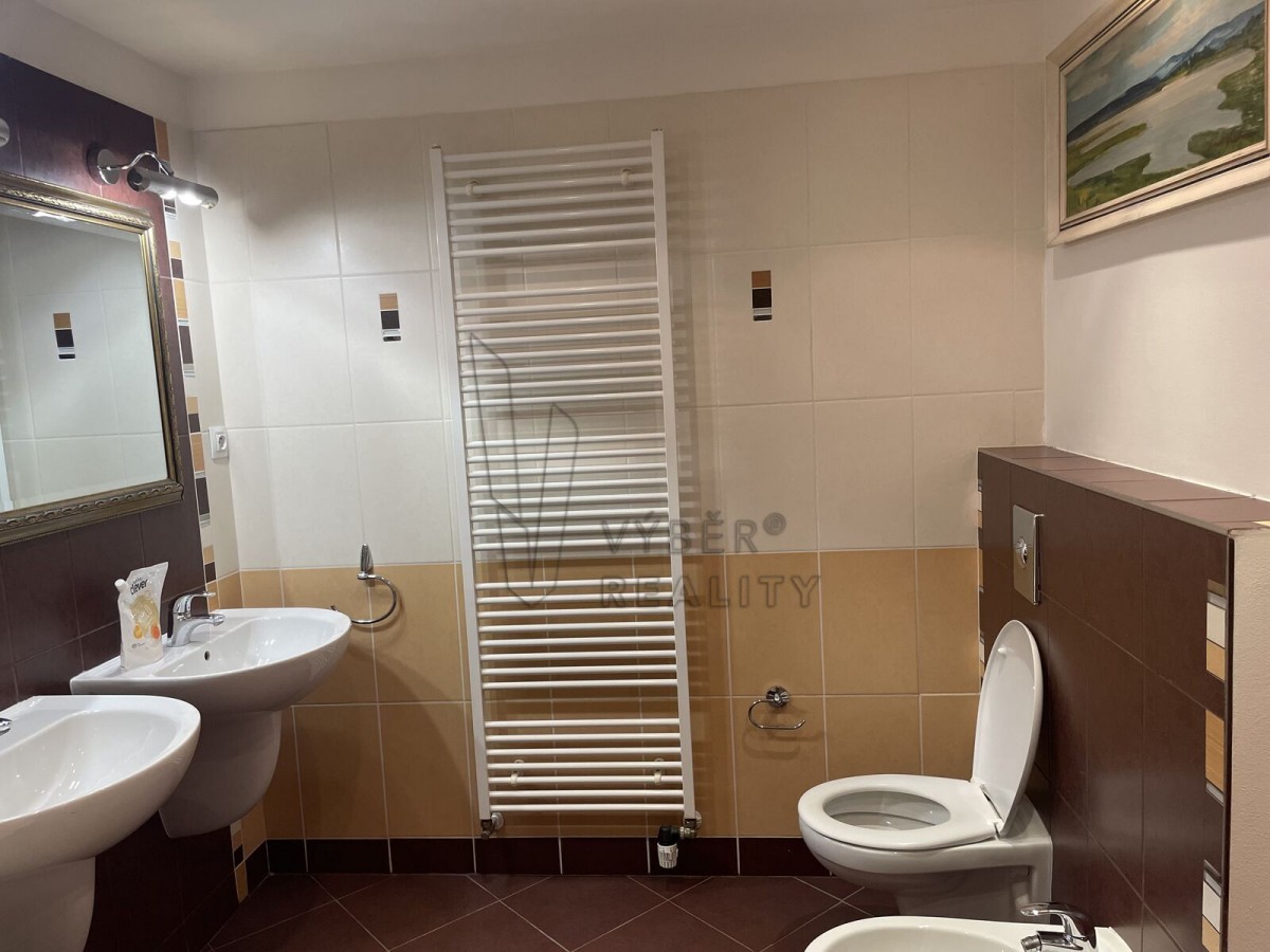 V horním patře se nacházejí 4 pokoje, z nichž 3 jsou neprůchozí, dále 2 šatny a 2 koupelny, obě vybavené vanou, bidetem a toaletou. Byt je vybaven zabezpečovacím systémem s možností připojení na Jablotron.