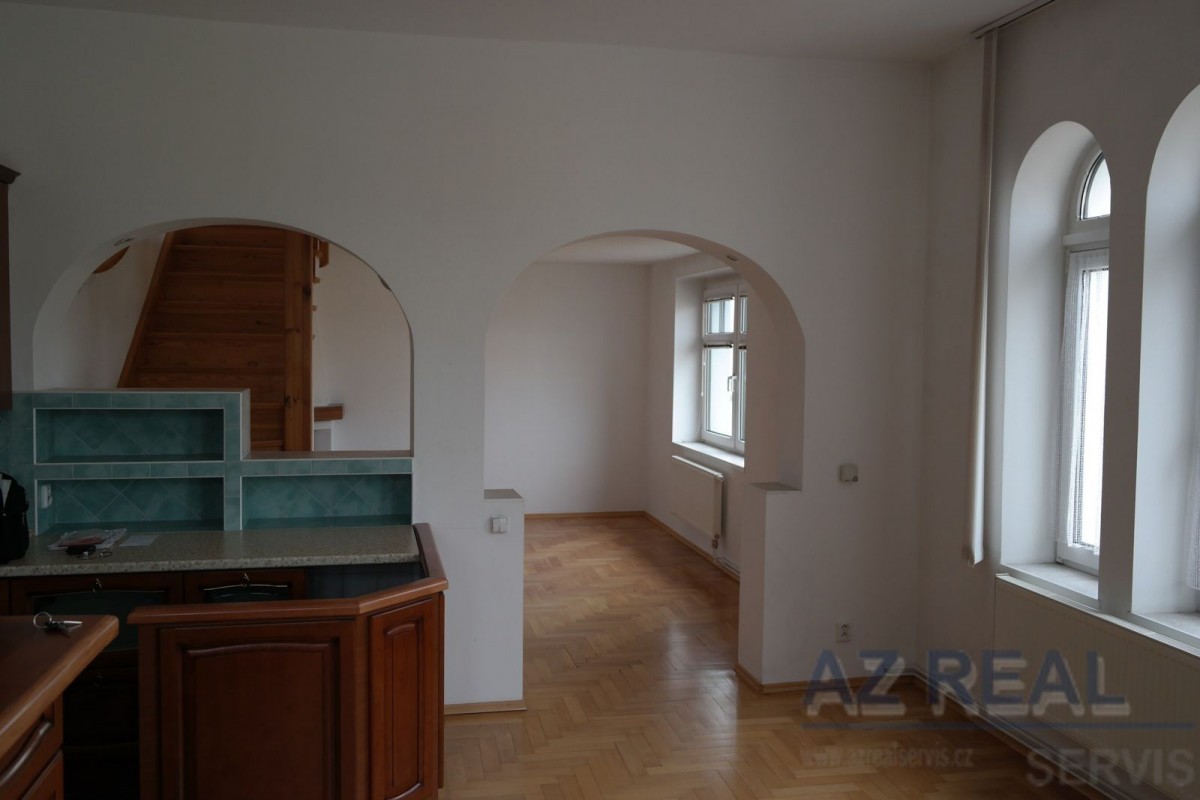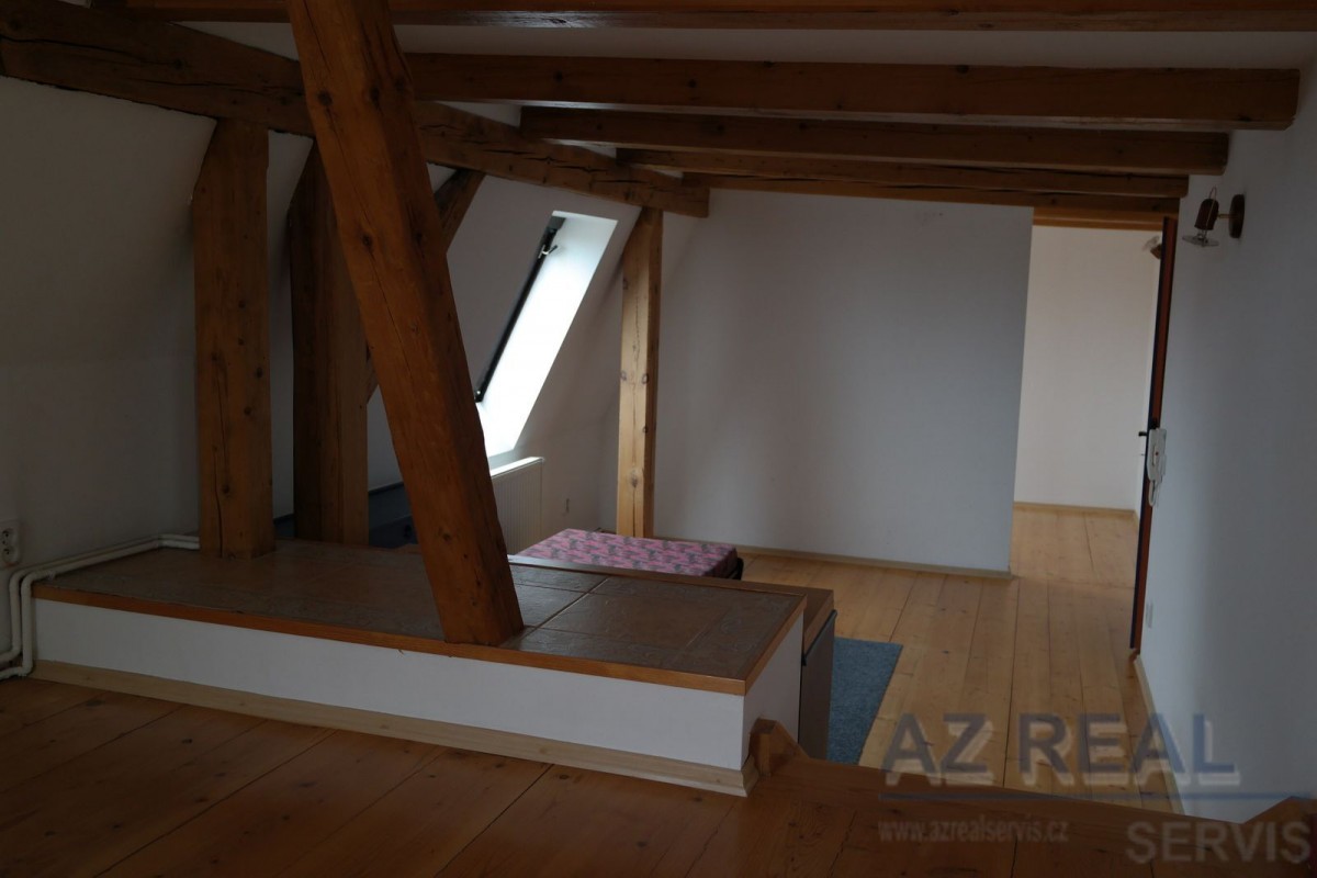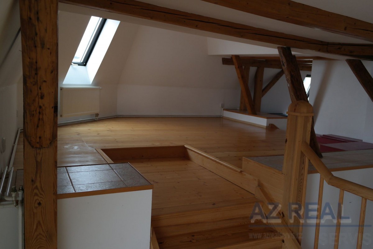 Exkluzivně nabízíme dlouhodobý pronájem nadstandardního podkrovního bytu v zrekonstruovaném domě v centru města Jablonce n. N. Dům je po kompletní revitalizaci fasády, oken i interiéru domu. Byt byl vybudován jako dvougene...rační s možností přepažení za vzniku dvou samostatných bytů. Každý má svou koupenu a kuchyňskou linku. Velmi hezky působí přiznané dřevěné trámy a krbová vložka, které vytváří příjemnou atmosféru bytu. Díky krbu se měsíční náklady na vytápění plynem s ohřevem TUV pohybují do pěti tisíc. Byt nabízí předsíň, ze které se jde do koupelny s sociální zařízení WC a do jídelny s kuchyňskou linkou. Odtud potom do místnosti obývacího pokoje s krbem, ze kterého vede dřevěné schodiště do podkroví. Tam se nachází velký členitější prostor s trámovým jako ložnice a velká šatna. Další místnosti patří již druhému bytu, který se skládá z předsíně s KK, atypickým obývacím pokojem, koupelnou a ložnicí. Vhodné pro větší rodinu nebo na ateliér spojený s bydlením. Dům je nekuřácký. Veškerá občanská vybavenost v místě.