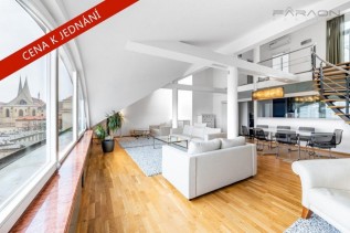 K pronájmu luxusní dvoupatrový byt 5+kk, 250 m2 s terasou a zimní zahradou, s nádherným výhledem na řeku Vltavu, Pražský Hrad a Petřín, v 6. a 7. patře kompletně... zrekonstruované historické secesní budovy včetně výtahu v blízkosti nábřeží, pár minut od Palackého náměstí a Karlova náměstí, v ulici Dřevná, Nové Město, Praha 2.