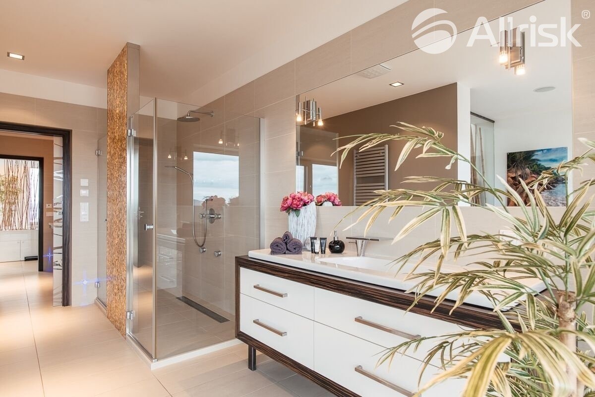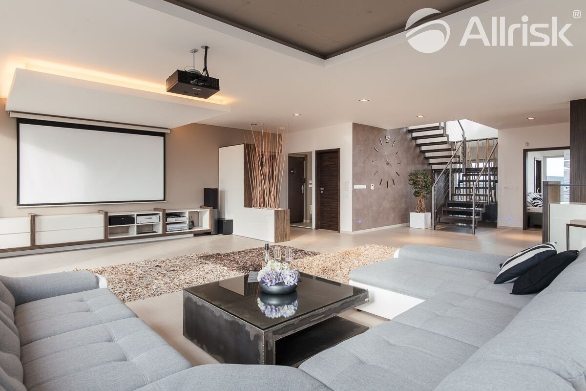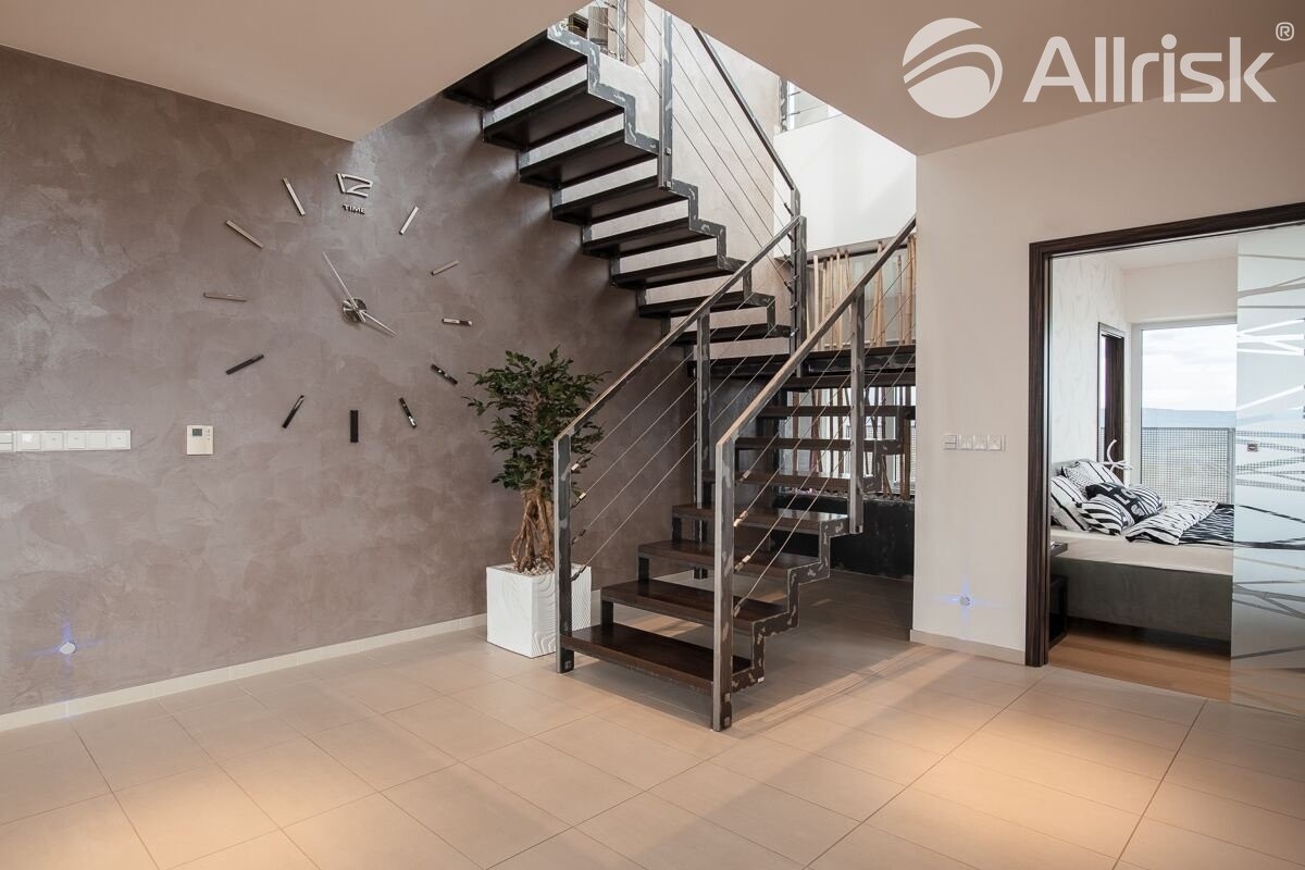 Interiér je moderně a nadstandardně vybaven, kompletně ozvučen kvalitní audiotechnikou, a to včetně koupelen a teras. Celek působí vzdušně, čistě a současně velice reprezentativně – ideální prostředí pro náročné bydlení i práci z domova.