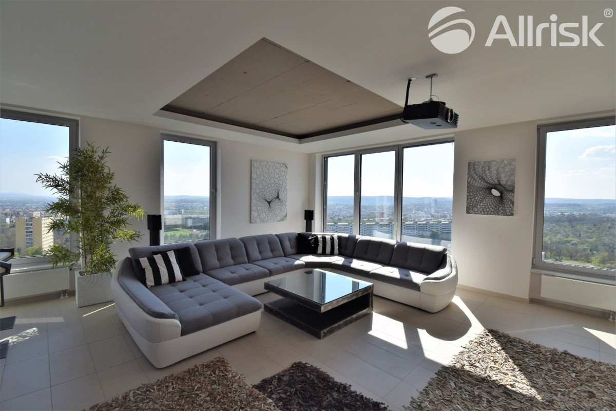 Byt o celkové ploše 300 m² je architektonicky výrazný, ...atypický a navržený pro ty, kteří hledají prostor, soukromí a inspiraci. Hlavní roli zde hrají panoramatické výhledy, které se otevírají z interiéru i teras – Brno a široké okolí jako na dlani, v každou denní i noční hodinu.