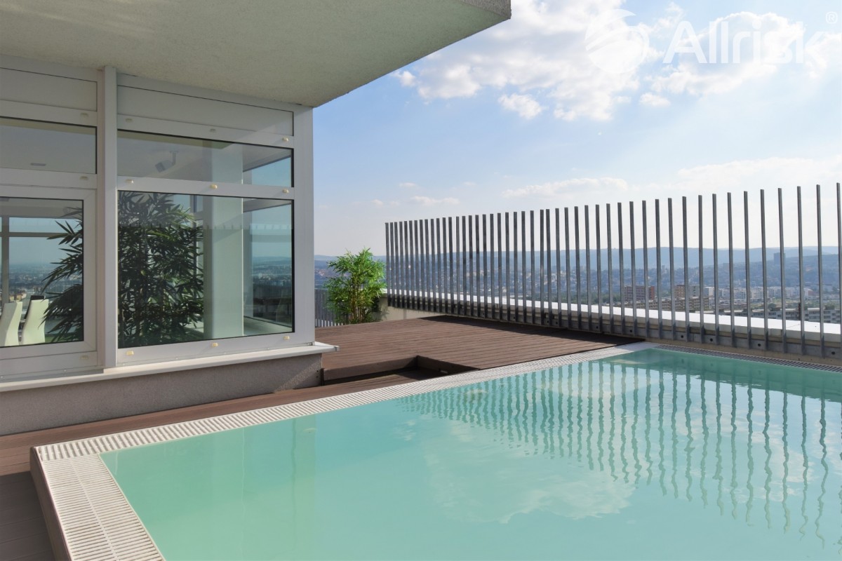 Naprostým unikátem je vlastní venkovní bazén se slanou vodou, umístěný na zatravněné terase. Privátní bazén přímo u bytu patří v Brně k naprostým výjimkám a posouvá tuto nabídku do zcela jiné kategorie bydlení.