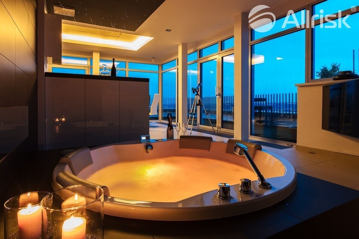 designová masážní sprcha, vana s výhledem do krajiny a vířivka pod umělou hvězdnou oblohou, která nabízí atmosféru klidu bez ohledu na počasí.