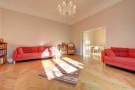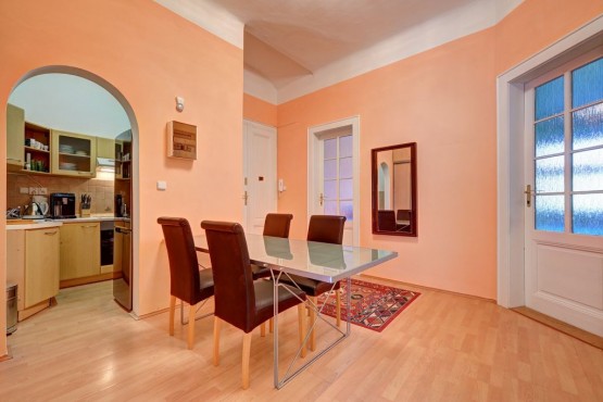 Byt je situován ve 4. patře udržovaného cihlového domu včetně výtahu. Díky umístění kuchyňské linky v komoře nabízí tento byt celkem čtyři prostorné pokoje. Dva pokoje jsou orientované do klidného vnitrobloku, další dva pokoje mají orientaci do ulice a poskytují dostatek světla. Dále byt sestává z koupelny se sprchovým koutem a samostatné toalety. K dispozici je také sklep. Aktuálně je byt zařízený dle fotografií, ale je možný pronájem zcela bez vybavení.