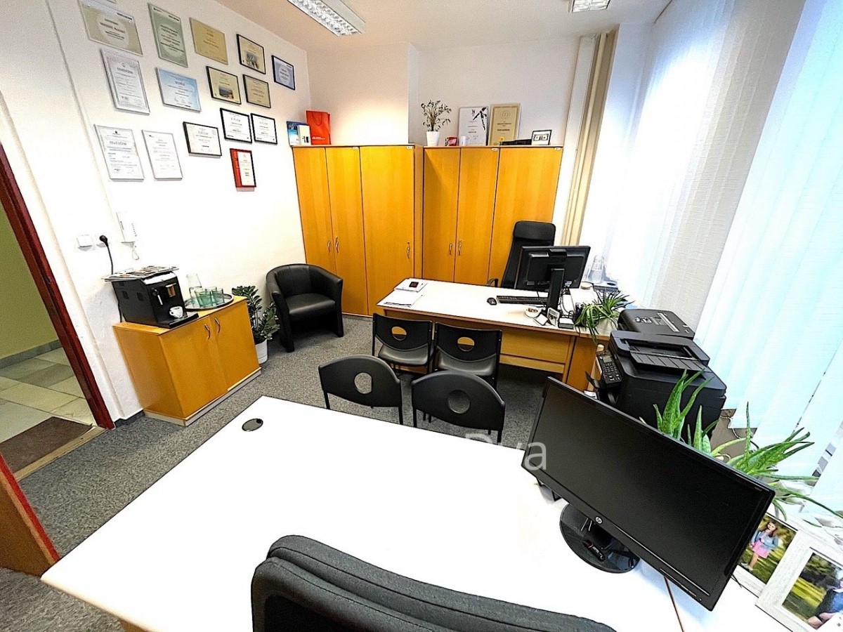 Nabízíme Vám k pronájmu kancelář o velikosti 21m2 v cihlové kancelářské budově v centru města. Kancelář lze pronajímat s uvedeným nábytkem na fotografiích nebo vybavení odstranit a pronajímat ji jako prázdnou. N...achází se v 1. nadzemním podlaží s možností využití kuchyňky a toalety na stejném podlaží.