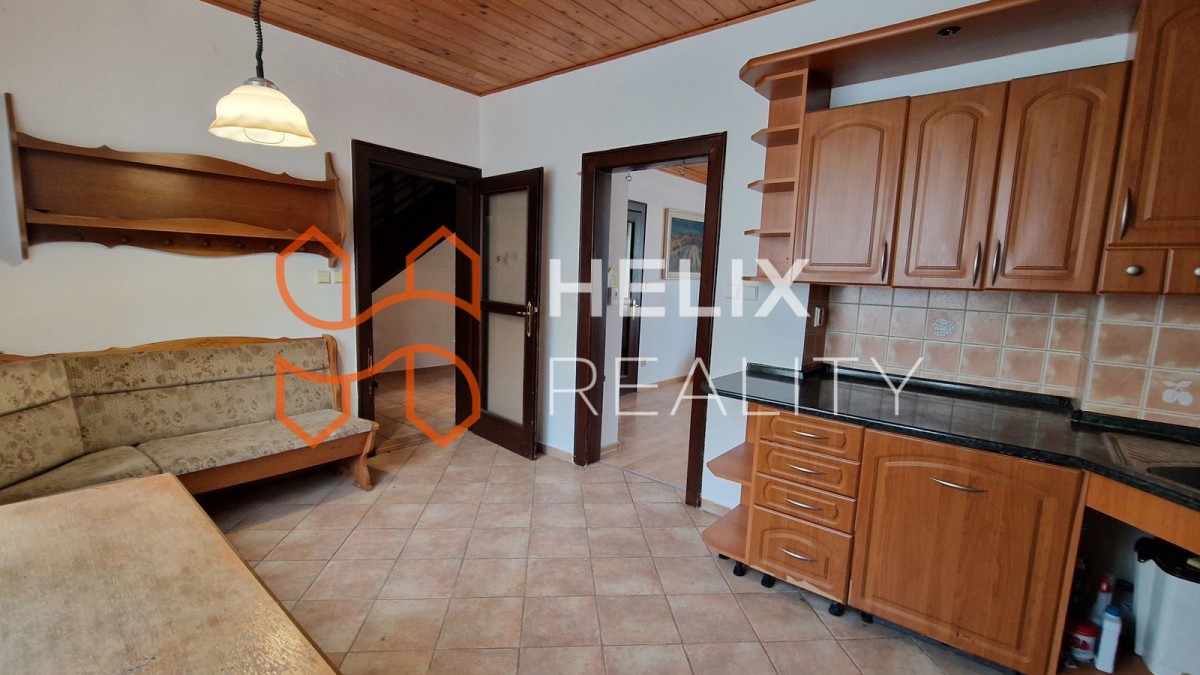 Popis: přízemí - vstupní hala, kuchyně (13, 5 m2) s rohovou kuchyňskou linkou a se vstupem do navazujícího obývacího pokoje s krbem (19 m2), do kterého se dá vejít také přímo z haly, koupelna s vanou a sociální zařízení WC (4 m2), vstup na zahradu (126 m2).