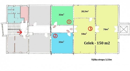 Cena nájmu : 200 Kč / m2/měsíc včetně vodného a stočného. Spotřeba 220V dle skutečnosti. Vytápění plynem - dle najatých m2.