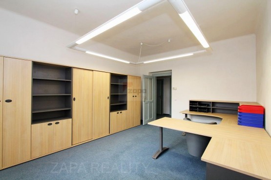 V přízemí jsou dvě jednací místnosti/kanceláře, kancelář (recepce), kuchyňka, 2 krát sociální zařízení WC a sklad, celkem 87m2 + terasa na zahradě. Prostory jsou částečně zařízeny nábytkem (lze vyklidit).