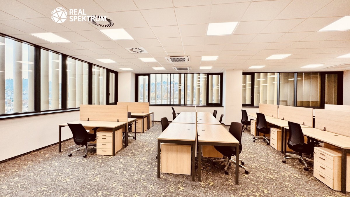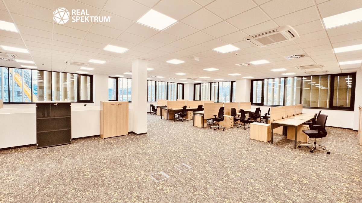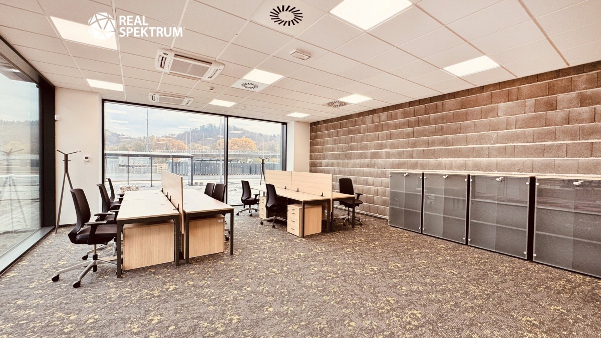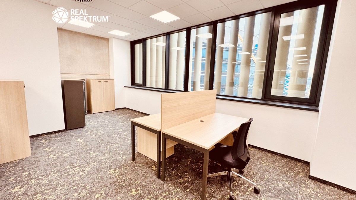 V nižším podlaží (96, 69 m²) je prostor vhodný pro vstupní lobby, jednací místnost či zázemí pro zaměstnance, horní podlaží (200, 36 m²) nabízí velkorysý, dobře prosvětlený kancelářský celek, který lze variabilně rozdělit na jednotlivé kanceláře, open space a zasedací místnosti podle potřeb nájemce. Prostory jsou vybavené moderním kancelářským nábytkem a umožňují tak rychlé nastěhování bez nutnosti velkých počátečních investic.