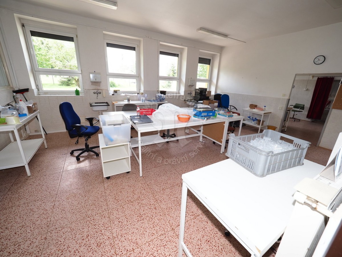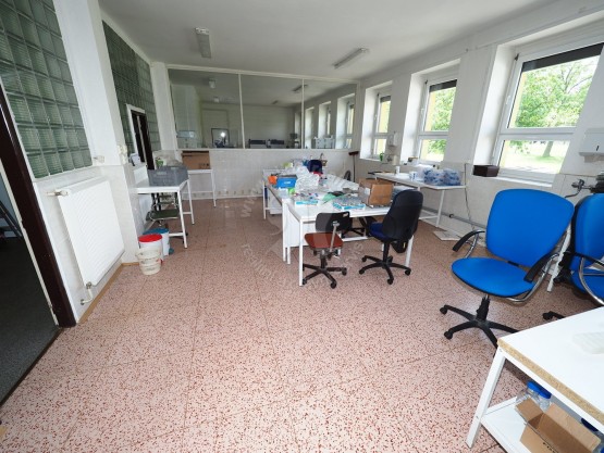 V přízemí jsou technické prostory přístupné z jihozápadu. Jedná se o místnosti využívané pův. jako laboratoře. Možnost využívat i jako skladovací / expediční provoz, servis zařízení, lehkou výrobu, aj. . Malý technický výtah do podkroví v případě současného pronájmu prostor v obou patrech. K dispozici: vstupní hala, 4 krát velká místnost s okny a PVC podlahou, chodba, sociální zařízení, sklad s možností využívání osazeného chladírenského zařízení, 2 krát menší místnost s keramickým obkladem a dlažbou, 1 krát velká místnost s keramickým obkladem a dlažbou.