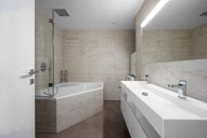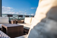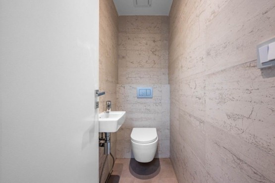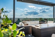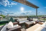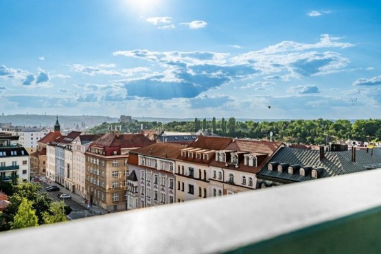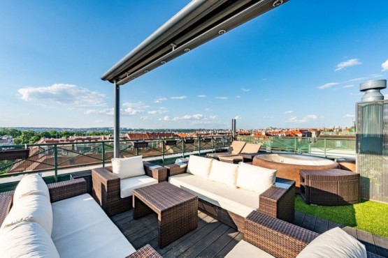 Interiér loftu tvoří - vstupní hala, 4 prostorné pokoje, otevřený prostor obývacího pokoje s kuchyní a jídelnou, dvě koupelny, jedna z nich s vanou, samostatná toaleta, 2 komory. Jeden z pokojů má vlastní balkon s posezením a orientací do vnitrobloku. Další patro loftu tvoří prostorný obývací pokoj s kuchyňkou a jídelnou a přímým výstupem na klenot tohoto bytu - exkluzivní 100 m2 terasu s jacuzzi, relaxačními lehátky, letním posezením, pergolou a naprosto unikátními výhledy na panorama Prahy.