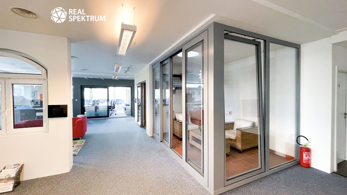 Jednotka je prosklená po obvodu budovy, s dostatkem denního světla a příjemnou pracovní atmosférou. Po předchozím nájemci může po dohodě zůstat vybudovaná část dispozice – recepce, zasedací místnost, dvě kanceláře, kuchyňka a serverovna. Zbytek plochy je připraven k úpravám. Případná vestavba či změna dispozice je možná, s tím, že tyto úpravy jsou považovány za vícenáklad nájemce.