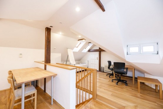 Jedná se o mezo...netový prostor, který má celkem dvě průchozí místnosti a balkón s nádherným výhledem na Petřín. Z průchozí místností se po schodech dostaneme do dalšího prostoru, který může sloužit jako relaxační zóna nebo další kancelář, včetně velkého úložného prostoru a trezoru.