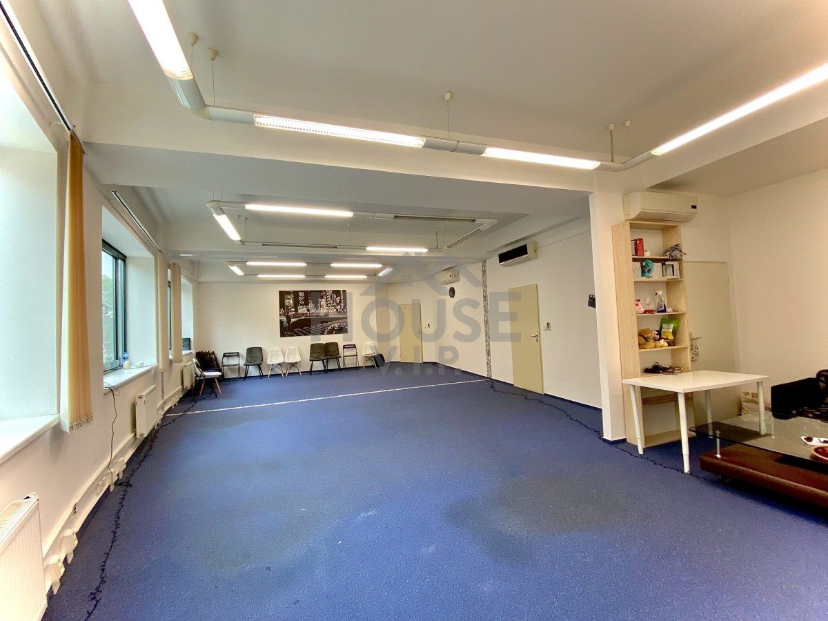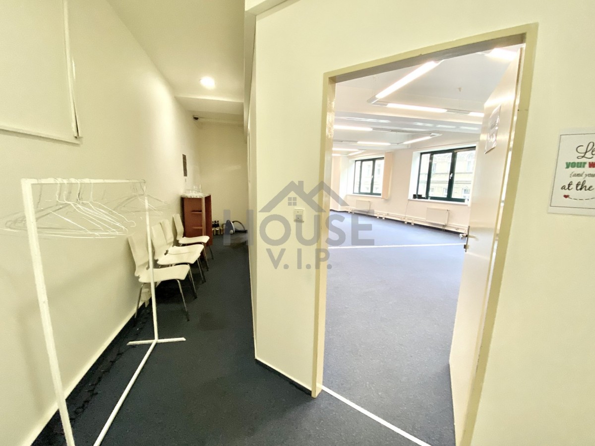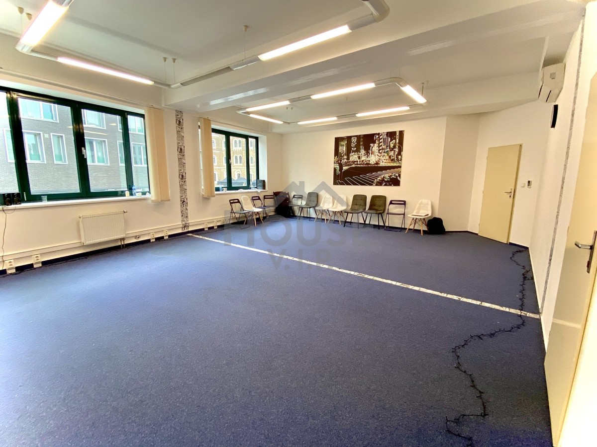 Prostorné místnosti: kancelář zahrnuje dvě místnosti, vlastní chodbu (cca 10m x 2m) a odkládací místnost (cca 4m x 3m).