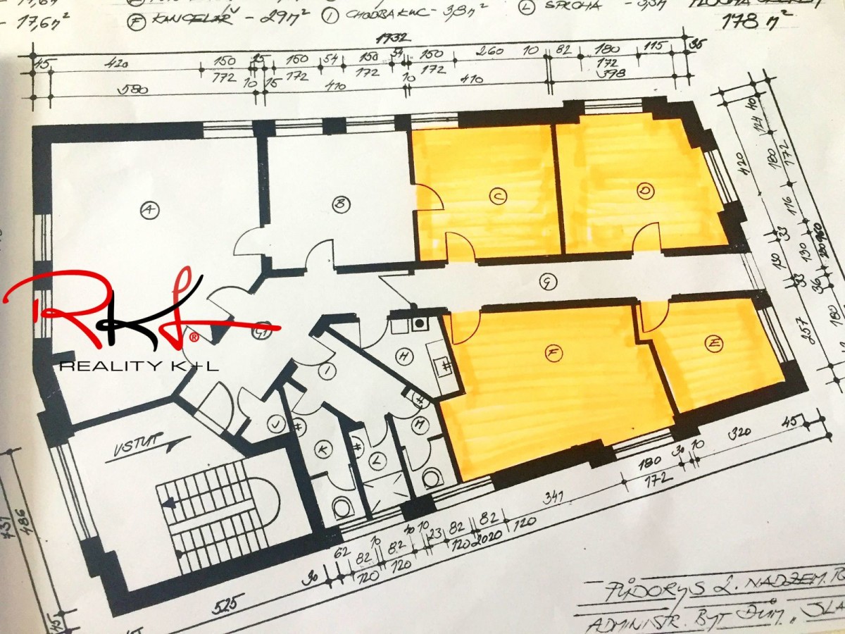 Dovolujeme si Vám nabídnout k pronájmu kancelářské - obchodní prostory, které se nacházejí v centru města Mladá Boleslav. Jedná se o čtyři neprůchozí místnosti o velikosti 77 m2, s vlastním sociálním zařízením..., vstupem a bezpečnostním systémem. Vyznačeny na půdorysu oranžovou barvou.