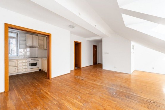 Dispozice zahrnuje - samostatná kuchyňka, dvě velké prostorné místnosti, další menší místnost, vstupní chodba, toaleta, koupelna.
