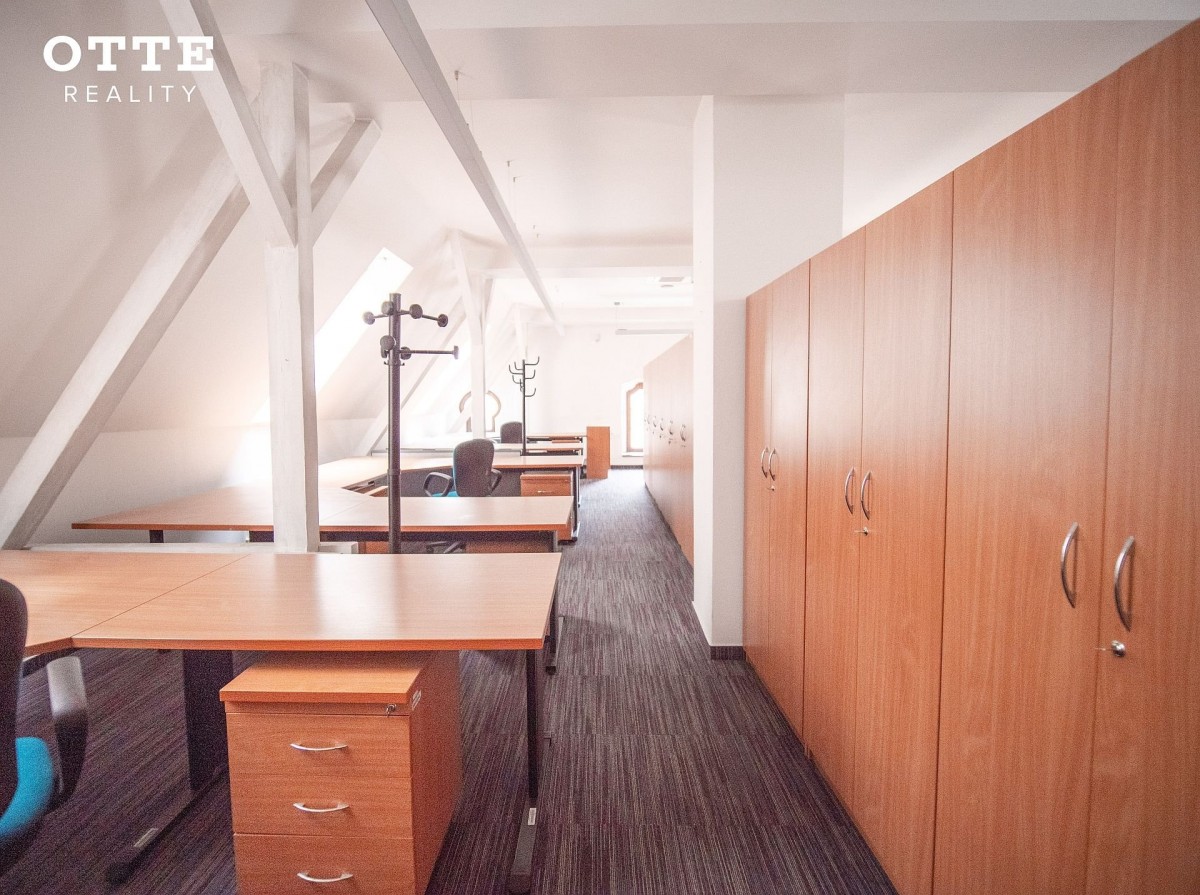 V prvním patře i podkroví jsou kanceláře, ve všech podlažích je také sociální zařízení a kuchyňky. Některé prostory jsou klimatizované. Nádherný je výhled z domu na náměstí Republiky. První patro je o velikosti cca 247 m2, podkroví má výměru cca 194 m2.