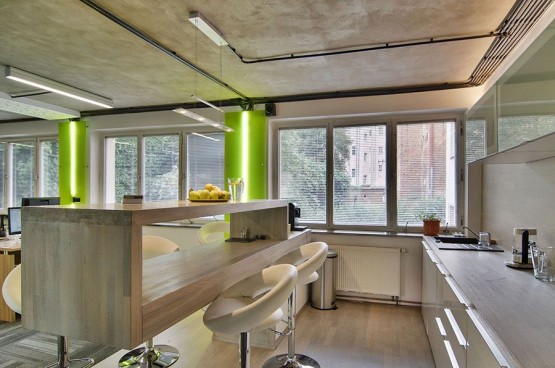 Prostor je koncipován jako tři samostatné prostory s kuchyňským koutem s b...arem. Vše je klimatizováno. Na podlaze nové koberce. V oknech žaluzie. Samozřejmostí rychlé připojení internetové připojeníu.