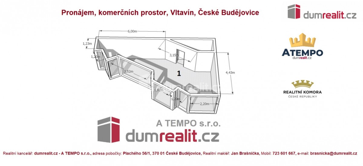 + zálohy na energie 3. 000, - Kč/měsíc. . pronájem komerčních prostor v OC Vltavín na sídlišti Vltava ve městě České Budějovice. K pronájmu prosklený prostor atypického tvaru. Cena nájemného činí 12. 000, - Kč + energ...ie 3. 000, - Kč/měsíc. Do objektu umožněn bezbariérový vstup. K zásobování lze využít nákladní výtah. V ceně pronájmu zahrnuto parkovací stání u objektu. Více info Vám poskytne realitní makléř Jan Brašnička. Ev. číslo: 641031. Energetický štítek: G