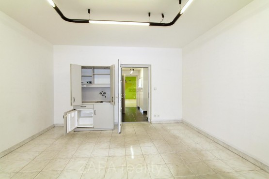 Prodejna o výměře 44 m2 pokračuje chodbou s úklidovou místností a sociální zařízení WC do kanceláře/skladu o výměře 23, 4 m2 s oknem od dvora a čajovou kuchyňkou. Vytápění zajišťuje vlastní plynový kotel. Nový nájemce může umístit svou reklamu na fasádu domu.