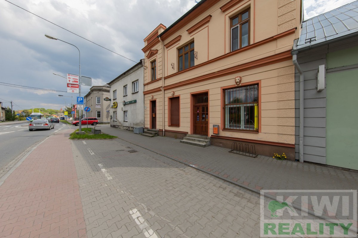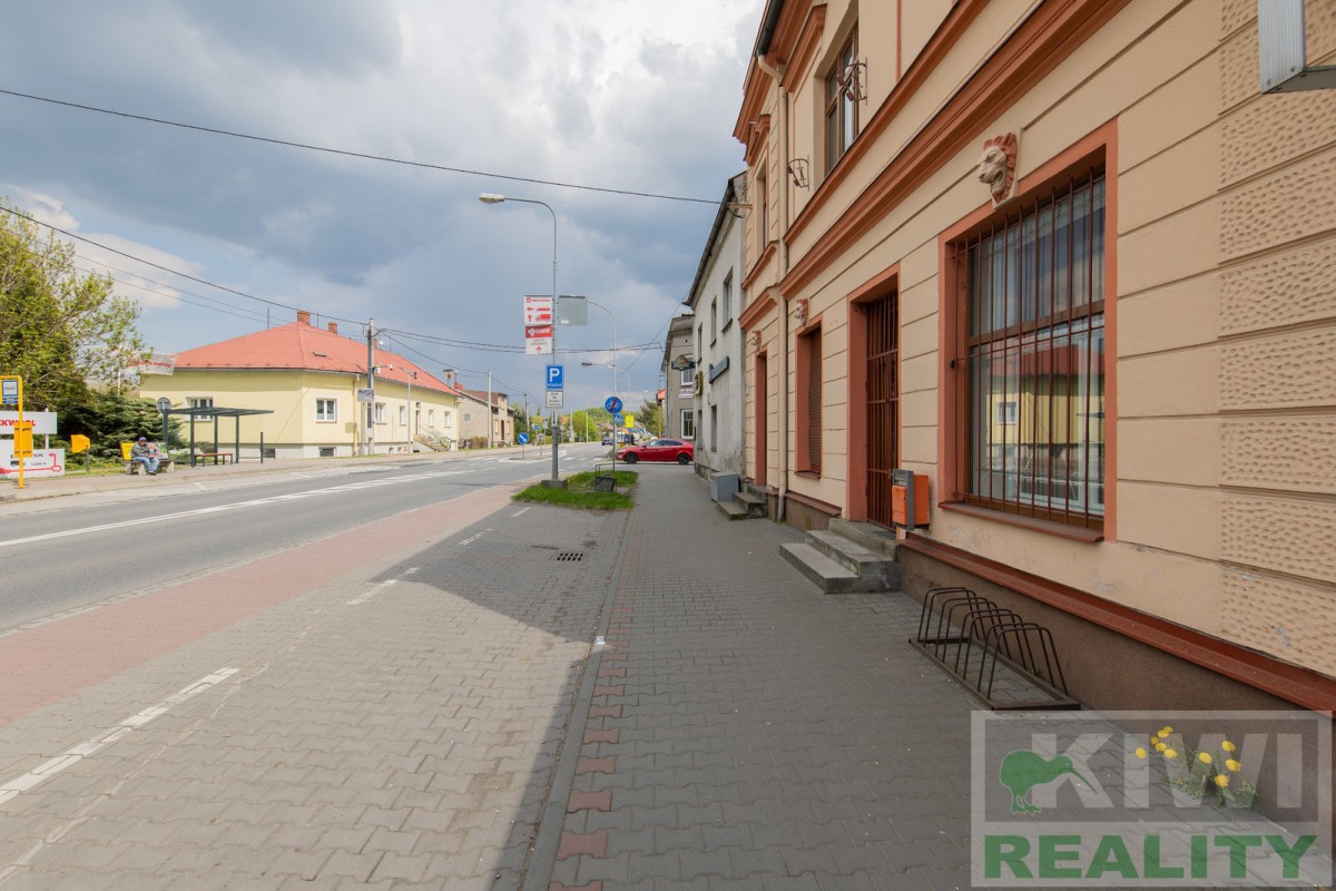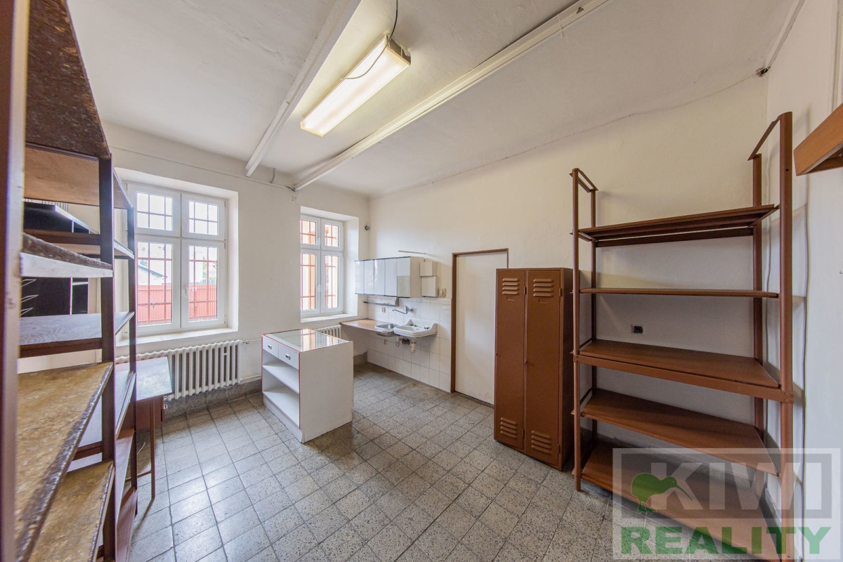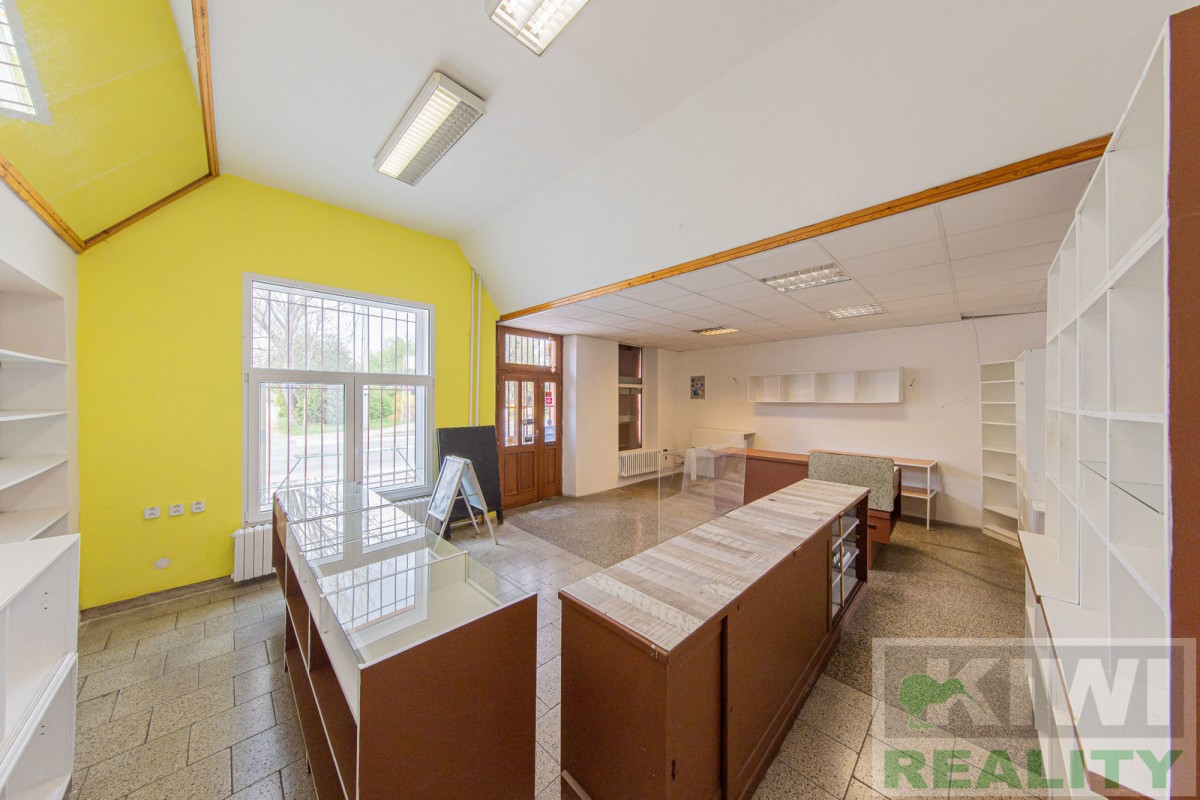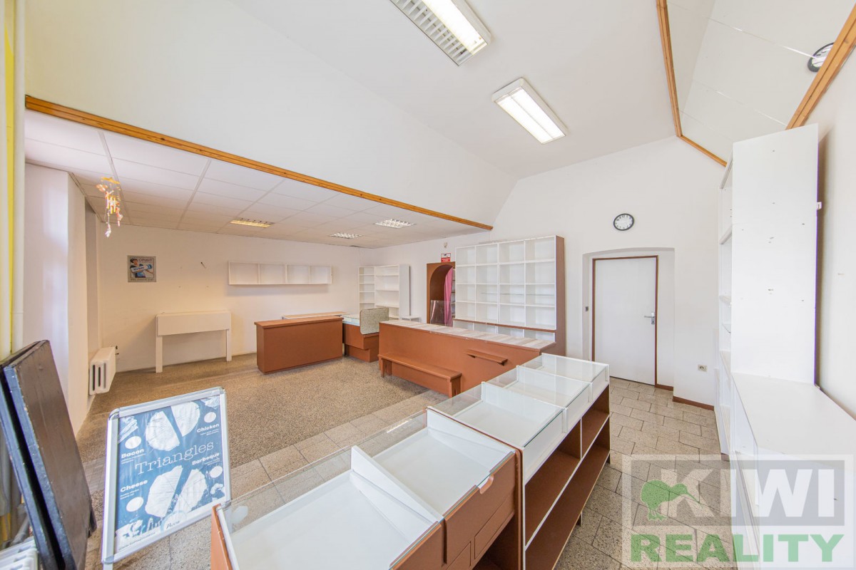 Prostory se skládají z velké vstupní místnosti o rozloze 40 m2 se samostatným vchodem z hlavní siln...ice (prodejna, kancelář, sklad). Dále je zde zadní místnost 20 m2 (kancelář, kuchyň), menší místnost 10 m2 (sklad) a sociální zařízení WC s umyvadlem. Před budovou se nachází vlastní parkoviště pro více aut. V minulosti prostory sloužily jako prodejna, trafika se smíšeným zbožím, potraviny nebo pošta expres (od roku 1991 do 2022).