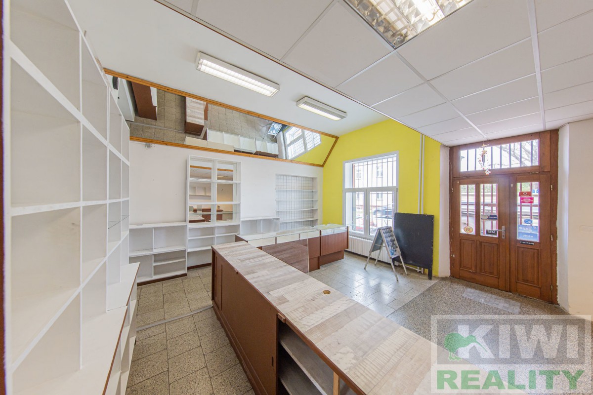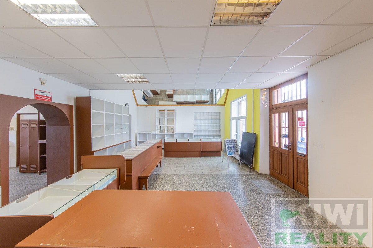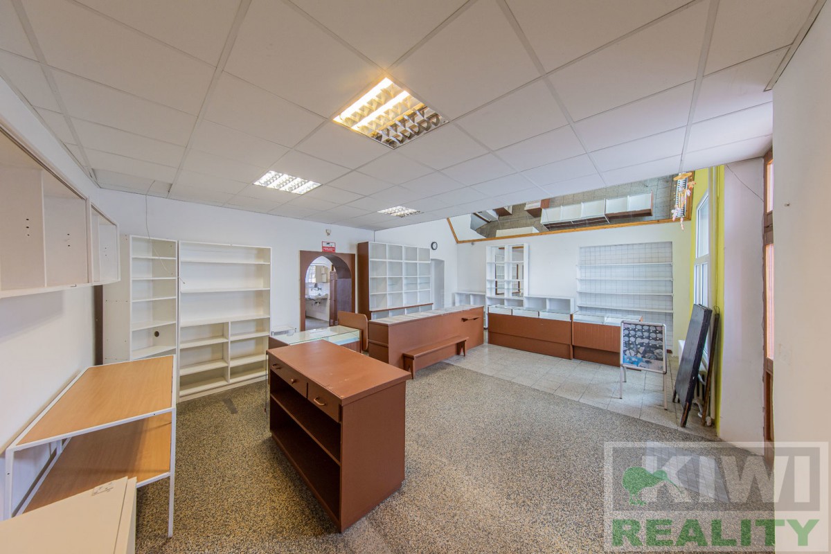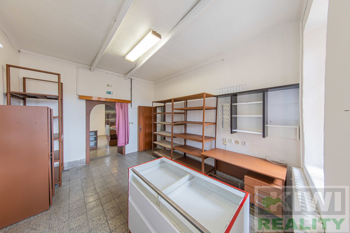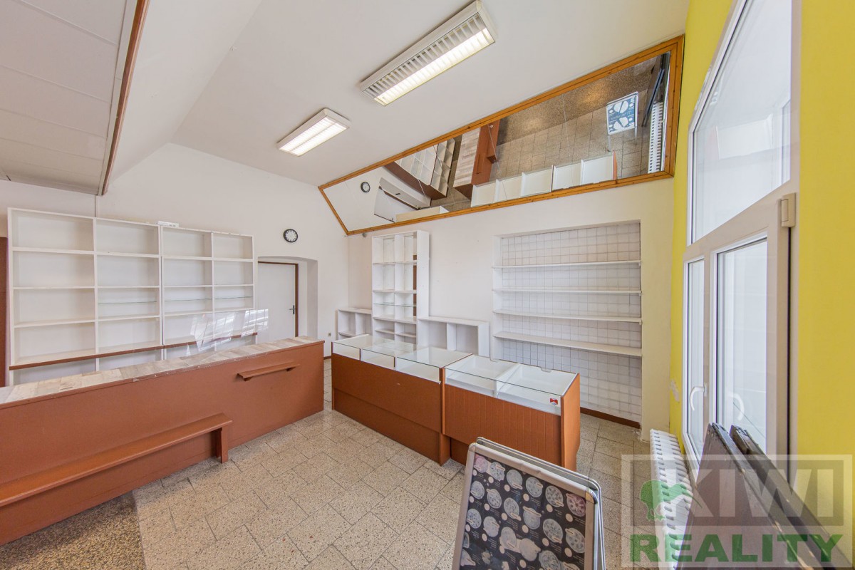 Prostory se skládají z velké vstupní místnosti o rozloze 40 m2 se samostatným vchodem z hlavní siln...ice (prodejna, kancelář, sklad). Dále je zde zadní místnost 20 m2 (kancelář, kuchyň), menší místnost 10 m2 (sklad) a sociální zařízení WC s umyvadlem. Před budovou se nachází vlastní parkoviště pro více aut. V minulosti prostory sloužily jako prodejna, trafika se smíšeným zbožím, potraviny nebo pošta expres (od roku 1991 do 2022).