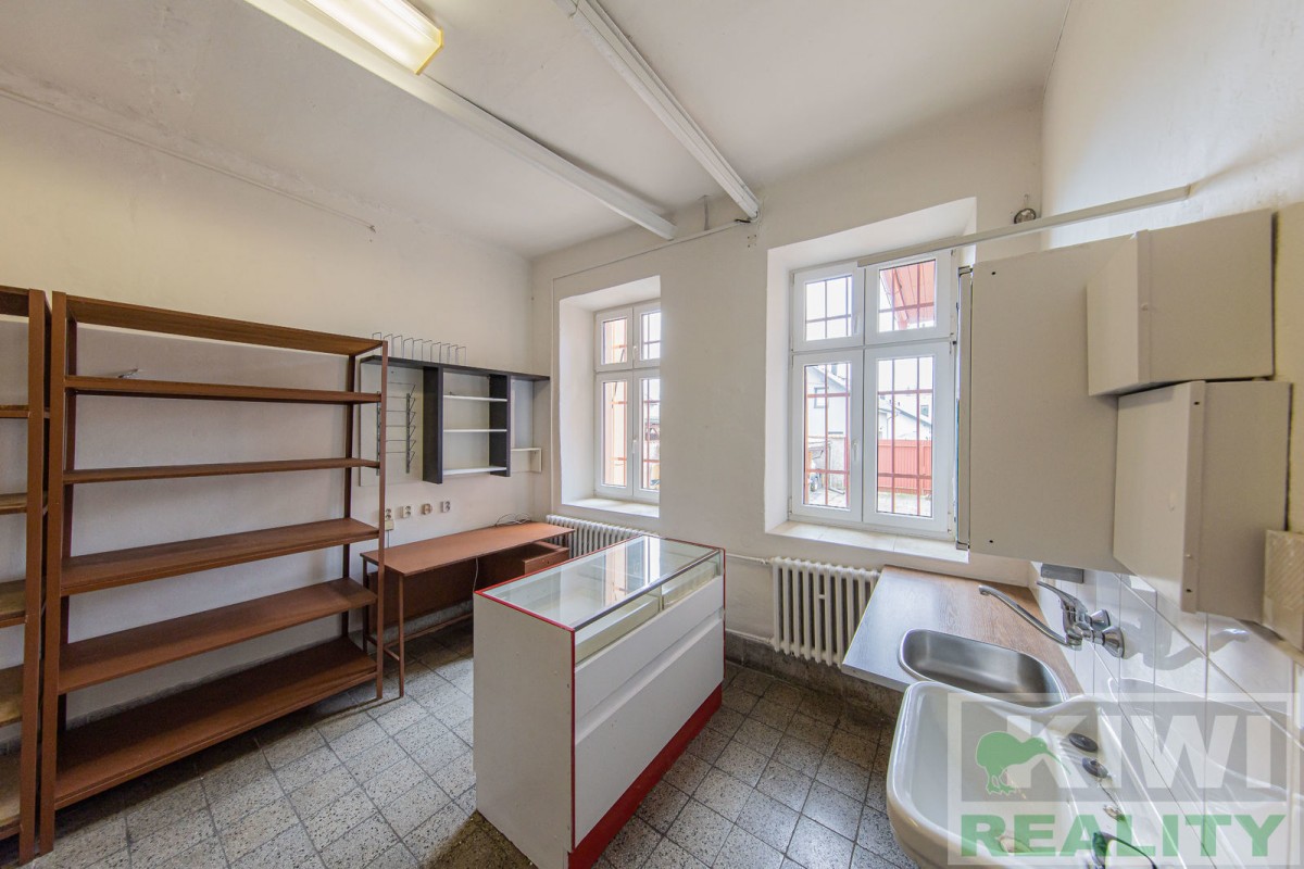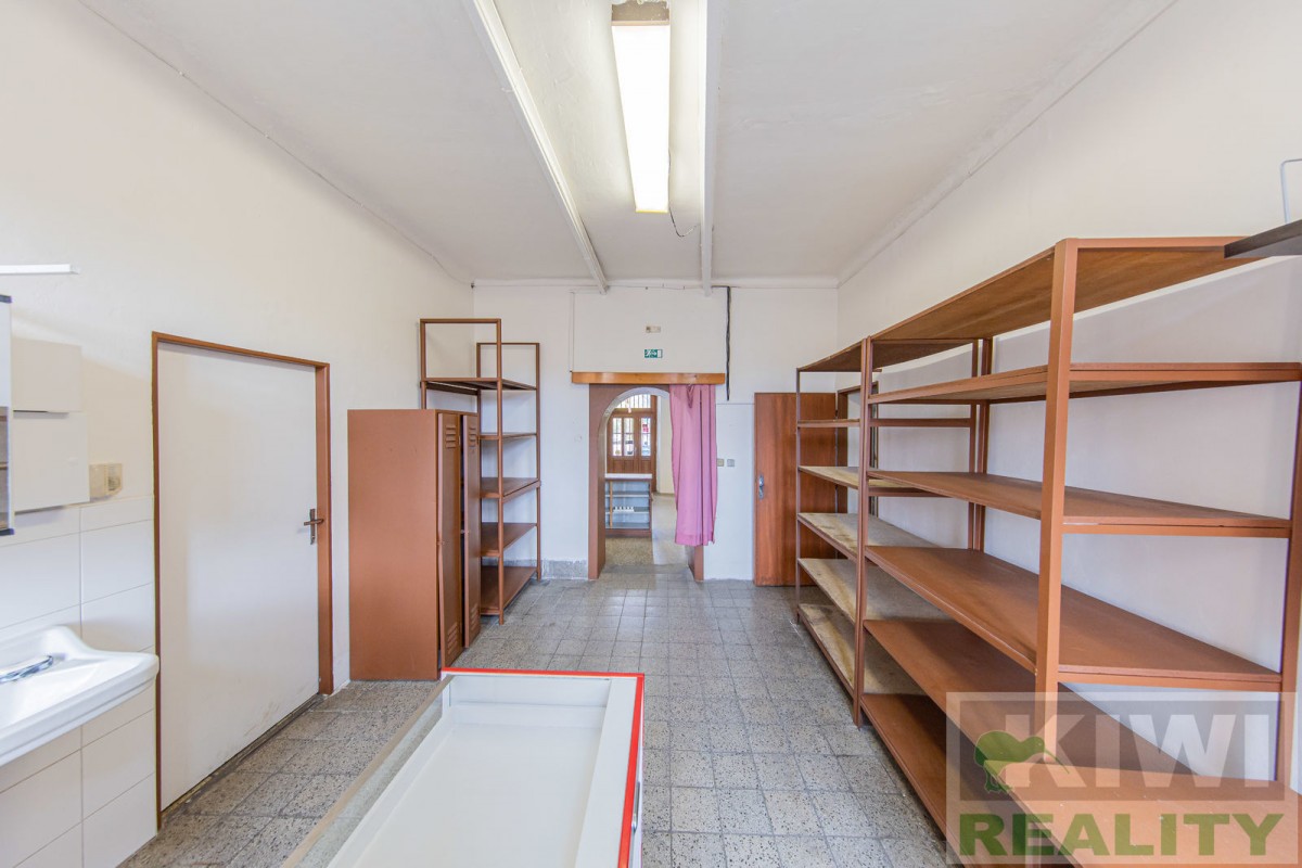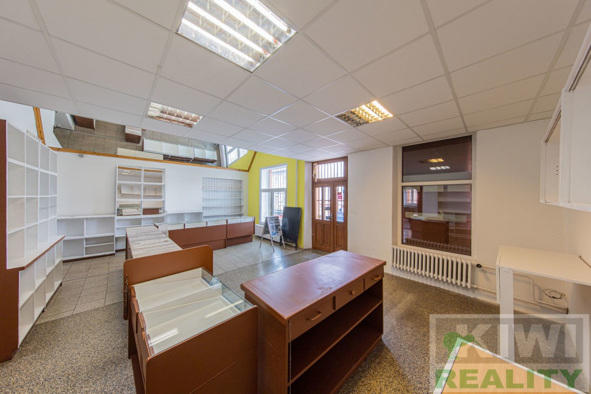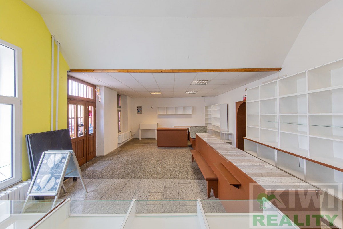 Prostory se skládají z velké vstupní místnosti o rozloze 40 m2 se samostatným vchodem z hlavní siln...ice (prodejna, kancelář, sklad). Dále je zde zadní místnost 20 m2 (kancelář, kuchyň), menší místnost 10 m2 (sklad) a sociální zařízení WC s umyvadlem. Před budovou se nachází vlastní parkoviště pro více aut. V minulosti prostory sloužily jako prodejna, trafika se smíšeným zbožím, potraviny nebo pošta expres (od roku 1991 do 2022).