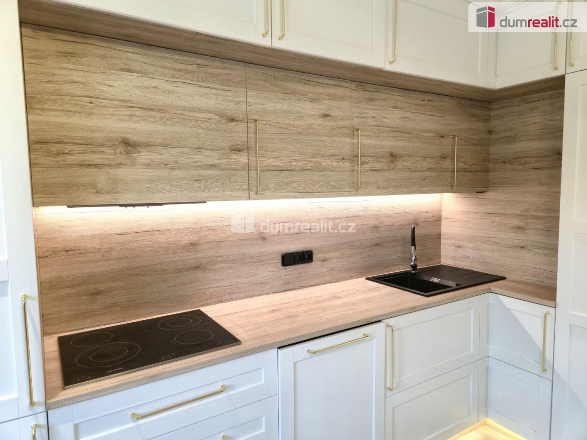 Dále se dostaneme chodby ve druhém patře, kde je přístup do prostorné kuchyně s novou luxusní linkou, s podsvícenými dvířky, vybavenou spotřebiči od Miele, za kterou je ukrytá ložnice. Z chodby je přístup také do zadní přístavby a na výrazně svažitou zahradu s terasami a místem s ohništěm.