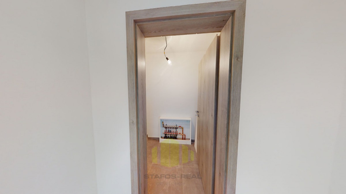 Návrh vnitřního uspořádání splní očekávání i náročných zákazníků, hledajících hezké, moderní bydlení s dostatkem prostoru. Přízemí domu nabízí velkorysý obývací pokoj s kuchyňským koutem, dále prostornou halu se schodištěm do podkroví, koupelnu s toaletou, vanou i sprchovým koutem a dvojumyvadlem, samostatnou toaletu s malým umyvadlem, místnost pro technické zázemí, zádveří vstupu do domu a v neposlední řadě dvě ložnice. V patře dále najdeme toaletu s malým umyvadlem a dva pokoje. Ohřev TUV a teplovodního podlahového topení zajišťuje tepelné čerpadlo se zásobníkem vody. Díky zvolenému primárnímu zdroji vytápění a ohřevu TUV je v domě nízká sazba odběru elektrické energie!