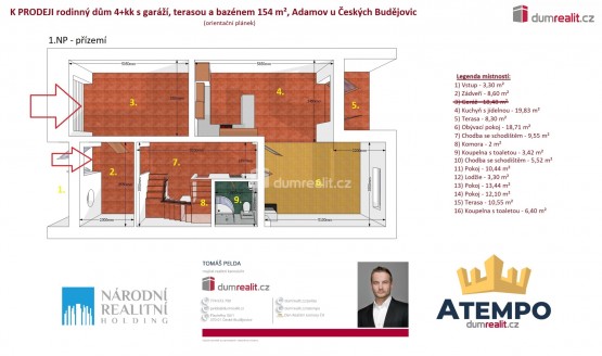 + záloha na vodné - stočné 1. 000, - Kč/měsíc. Elektřina a plyn se přepisuje na nájemce. . Dumrealit. cz Vám nabízí pronájem útulného řadového rodinného domu 4+kk se dvěma ko...upelnami, terasou, balkónem, krytým parkovacím stáním a zahrádkou s pergolou a bazénem v klidné části obce Adamov u Českých Budějovic, ul. Třešňová č. p. 199. Dům je přípraven a nachystán k okamžitému nastěhování! Podrobné rozkreslení dispozice jednotlivých podlaží naleznete na orientačním plánku mezi fotografiemi. Z terasy a balkónu je moc hezký výhled na hlavní město jihočeské metropole České Budějovice. Vytápění domu a ohřev teplé vody je plynovým kotlem. Dům je napojen na elektřinu, plyn, veřejný vodovod a městskou kanalizaci. Náklady na elektrickou energii a plyn činil v roce 2024 5. 200, - Kč/měsíčně pro 3 osoby - přepisuje se na nájemce. Hledáme dlouhodobé a solidní nájemce. Více info Vám poskytne realitní makléř Tomáš Pelda z realitní kanceláře A TEMPO fungující pod ochranou známkou dumrealit. cz. Ev. číslo: 650557. Energetický štítek: G