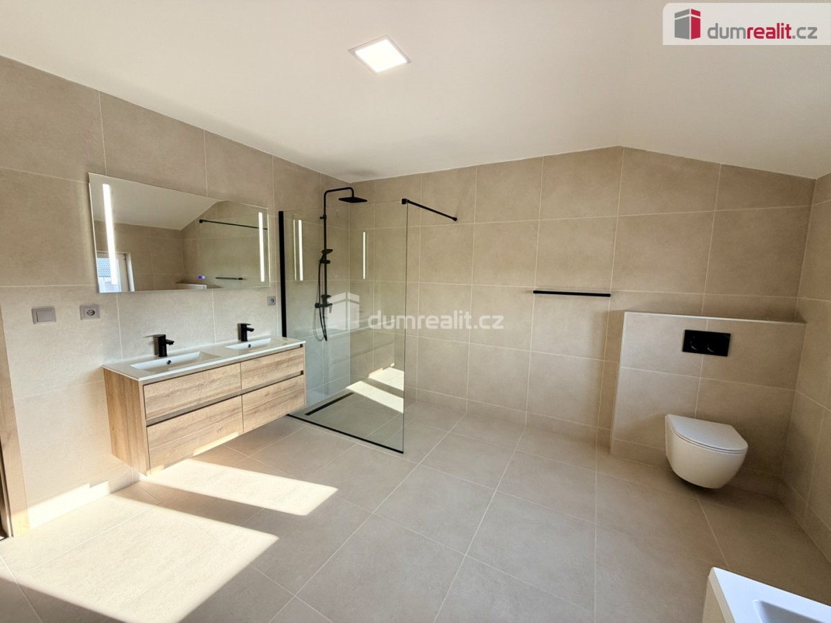 V patře najdeme 3 ložnice a velkoryse řešenou koupelnou s sociální zařízení WC, sprchovým koutem a vanou.