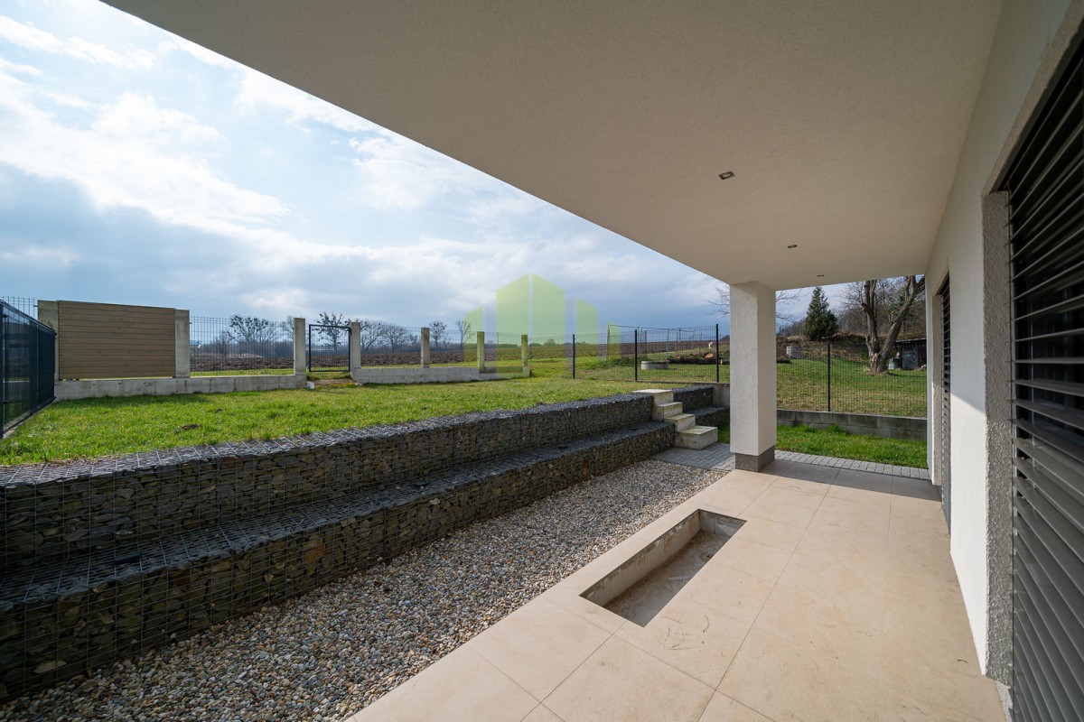 Exteriér domu je obohacen o atriovou zahradu s bezpečným prostorem pro hraní dětí, betonovou terasou a retenční nádrží pro ekonomické zavlažování. Vybavenost domu zahrnuje moderní kuchyňské spotřebiče, designové radiátory, šatní skříně a další úložné prostory po celém domu, což zajišťuje pohodlí a praktičnost.