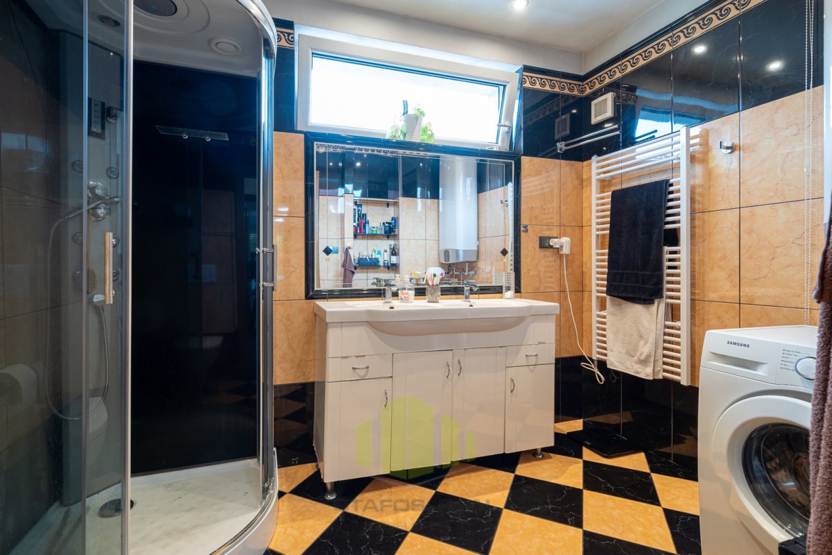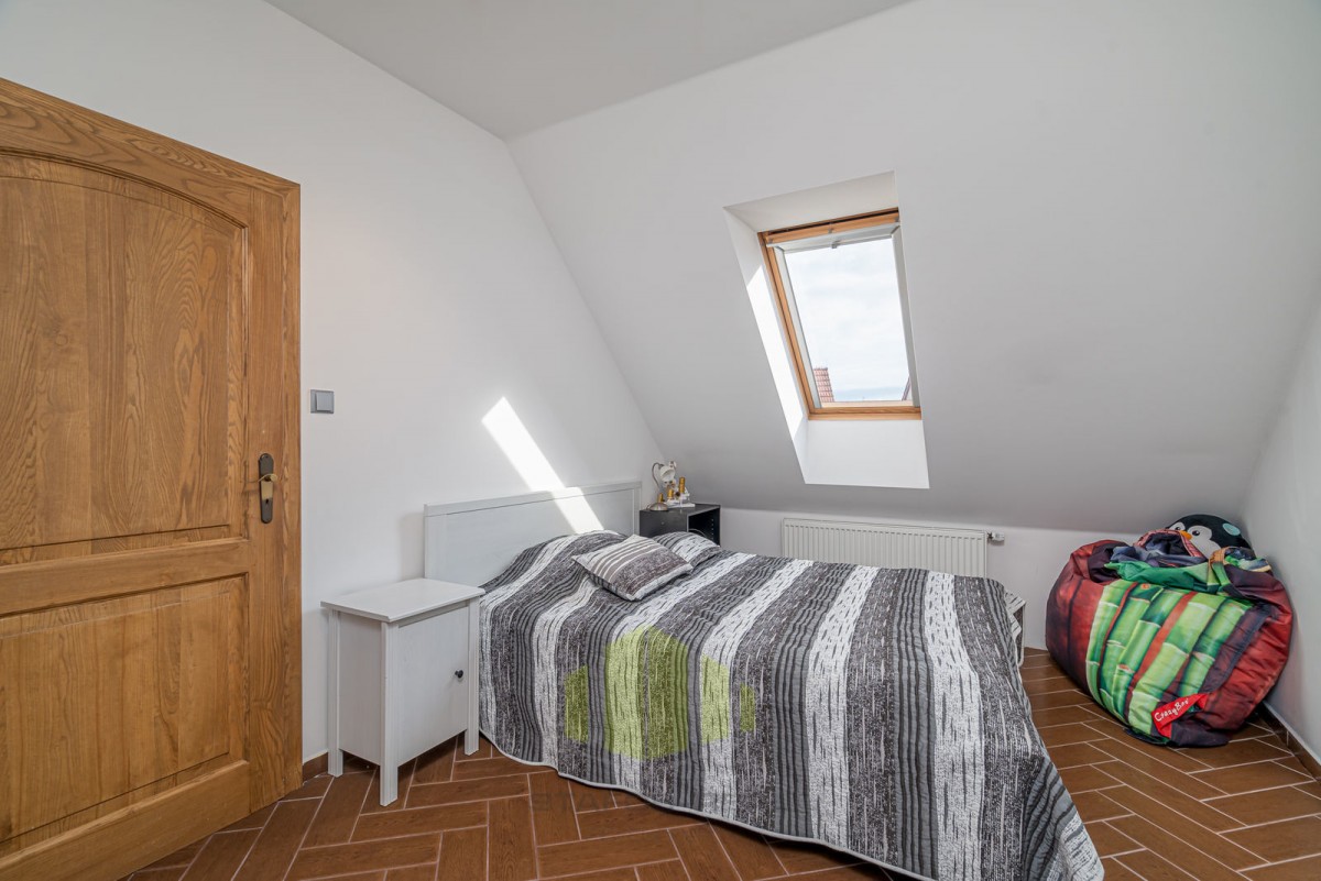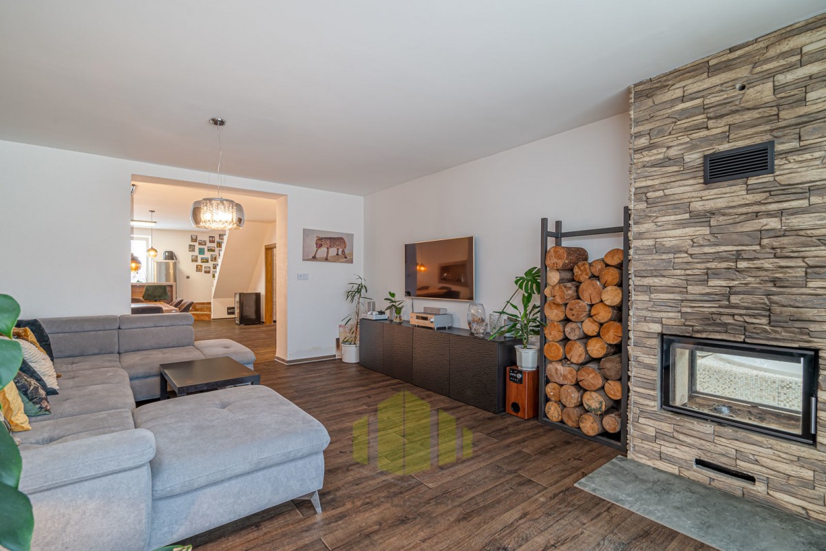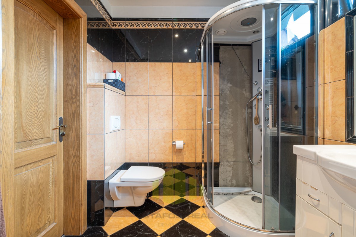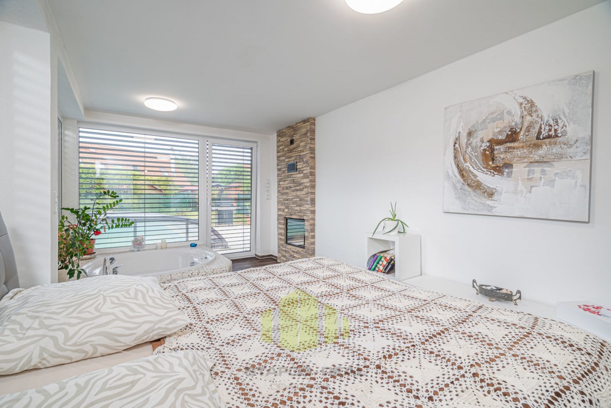 Vila se pyšní užitnou plochou 168 m2 a disponuje příjemným layoutem. Přízemí je tvořeno vstupní halou, vybavenou kuchyní, jídelnou, útulným obývacím pokojem s krbem, koupelnou, toaletou a ložnicí s vanou. V prvním patře najdete další dvě ložnice, z nichž jedna disponuje vířivou rohovou vanou a toaletou.