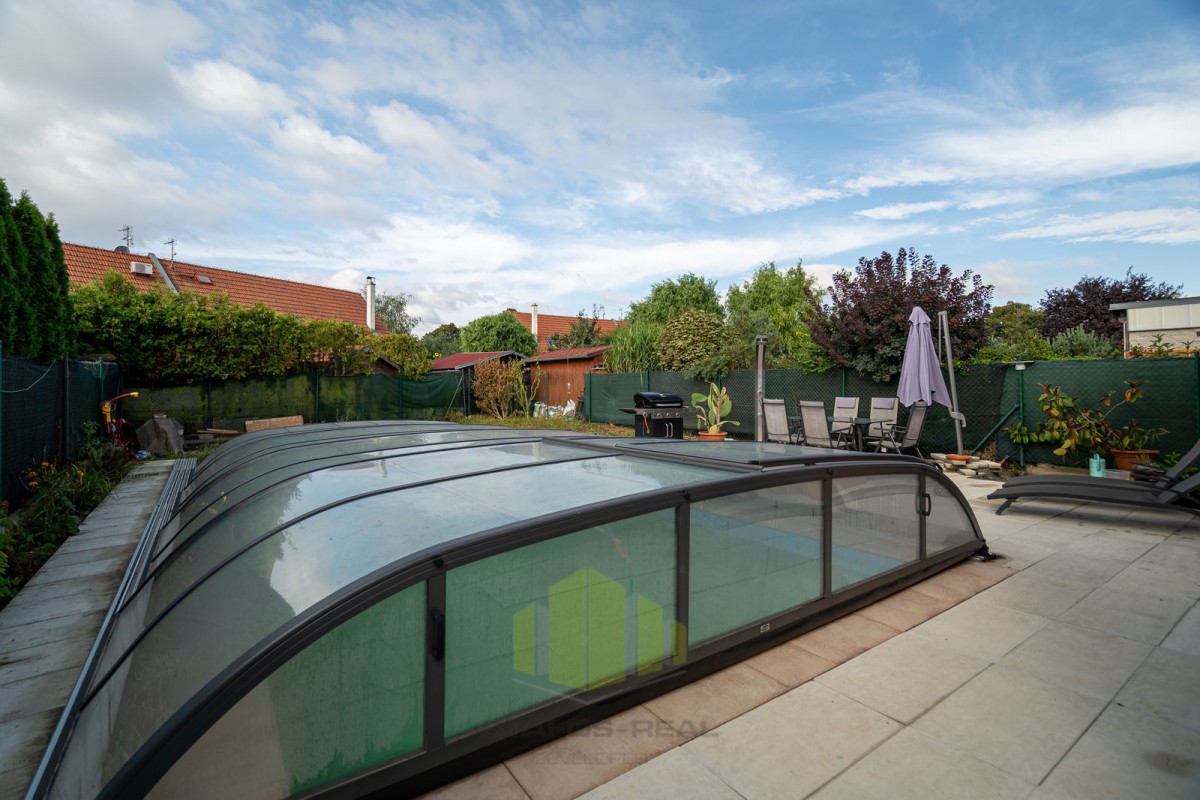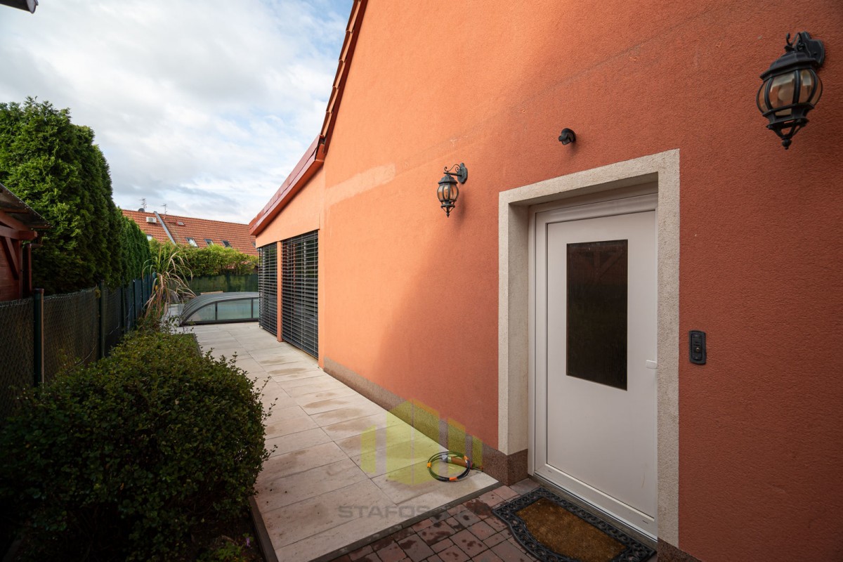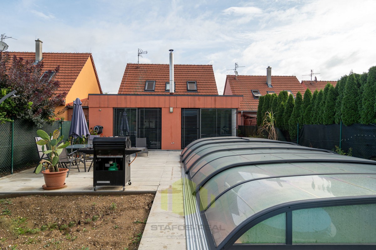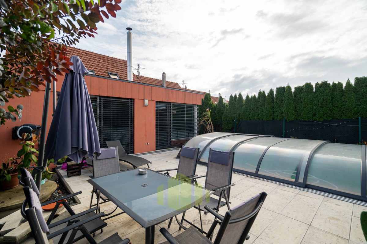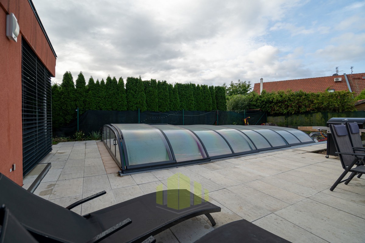 Dům je postaven z prvotřídních materiálů a jeho exteriéru dominuje bazén se zastřešením a útulné posezení. Parkování je možné pro až tři auta přímo před domem.