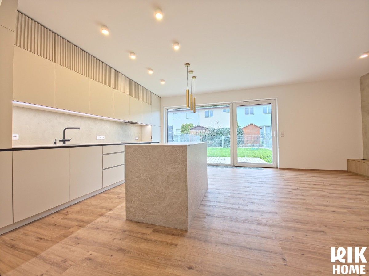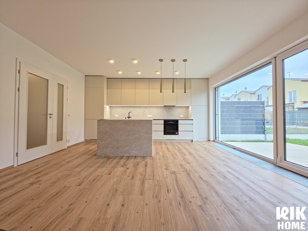 Kuchyň je propojena s obývacím pokojem a celý prostor je řešen ve vysokém standardu s důrazem na kvalitu provedení a funkčnost. Naproti kuchyňské lince je připravena přípojka pro TV, podél stěn jsou vestavěné skříně. Z obývacího pokoje je přímý vstup na zahradu o velikosti 76 m², která poskytuje dostatek prostoru pro odpočinek i rodinné posezení.