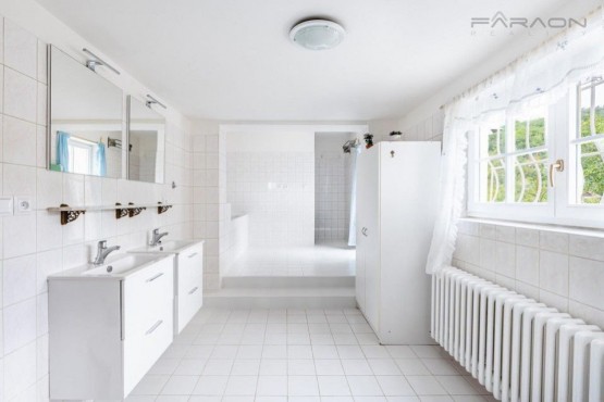 Dispozice: vstupní chodba, jídelna propojená obývacím pokojem a přímým vstupem na terasu a krbem, plně vybavená kuchyň, koupelna s vanou, toaletou, bidetem a pračkou a také samostatná toaleta. V patře je hlavní ložnice s vestavěnou skříní, druhá ložnice s přístupem na terasu a třetí ložnice s vlastní šatnou a vstup do půdních prostor. V přízemí se nachází další dvě ložnice, technická místnost, druhá koupelna s vanou a toaletou, další samostatná toaleta a menší kuchyňka s jídelním koutem, odkud je přímý vstup na zahradu.