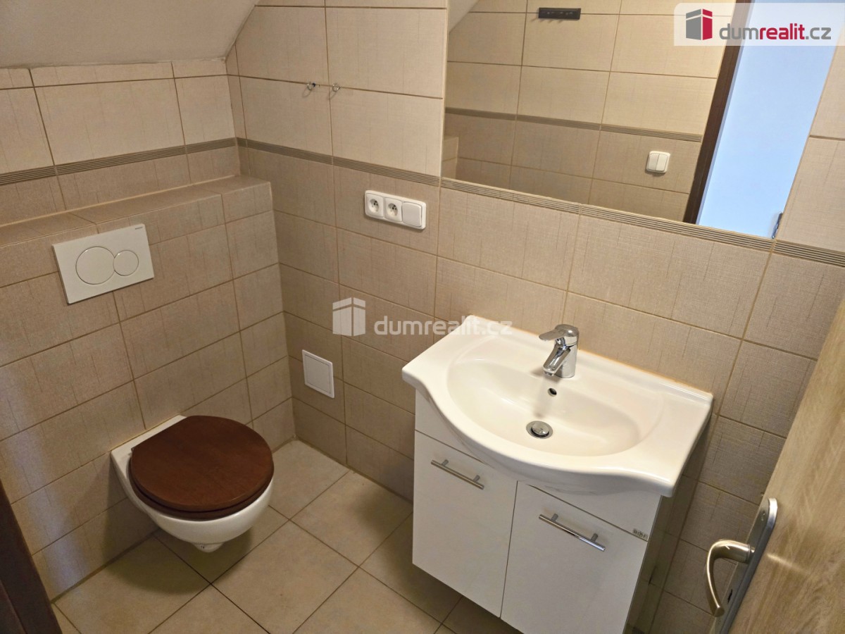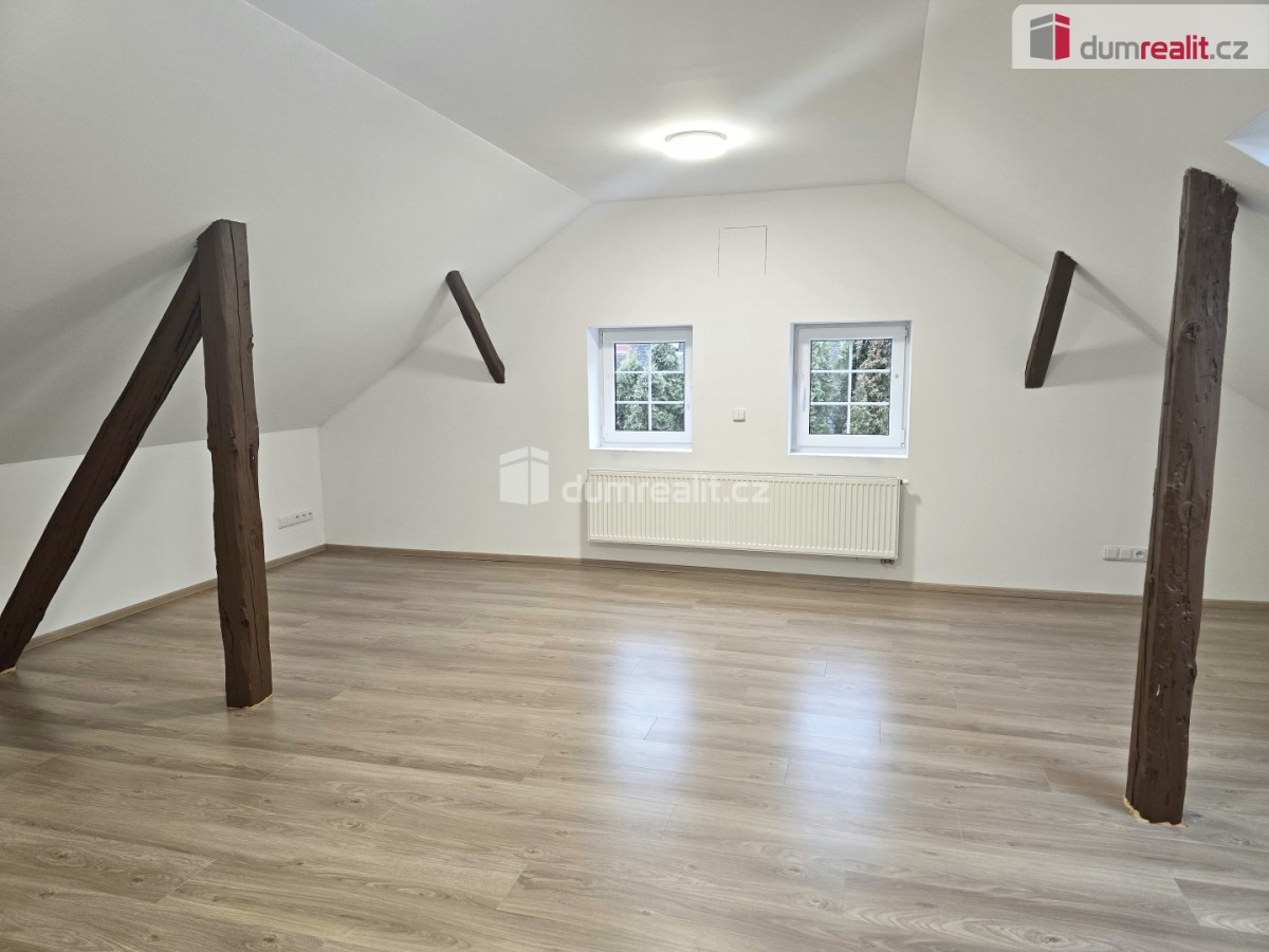 V patře je jedna velká místnost vhodná jako velký obývací pokoj nebo ložnice. Po celém domě jsou nové plovoucí podlahy, keramická dlažba, nová plastová okna se žaluziemi. Za domem je zahrada s menší terasou.